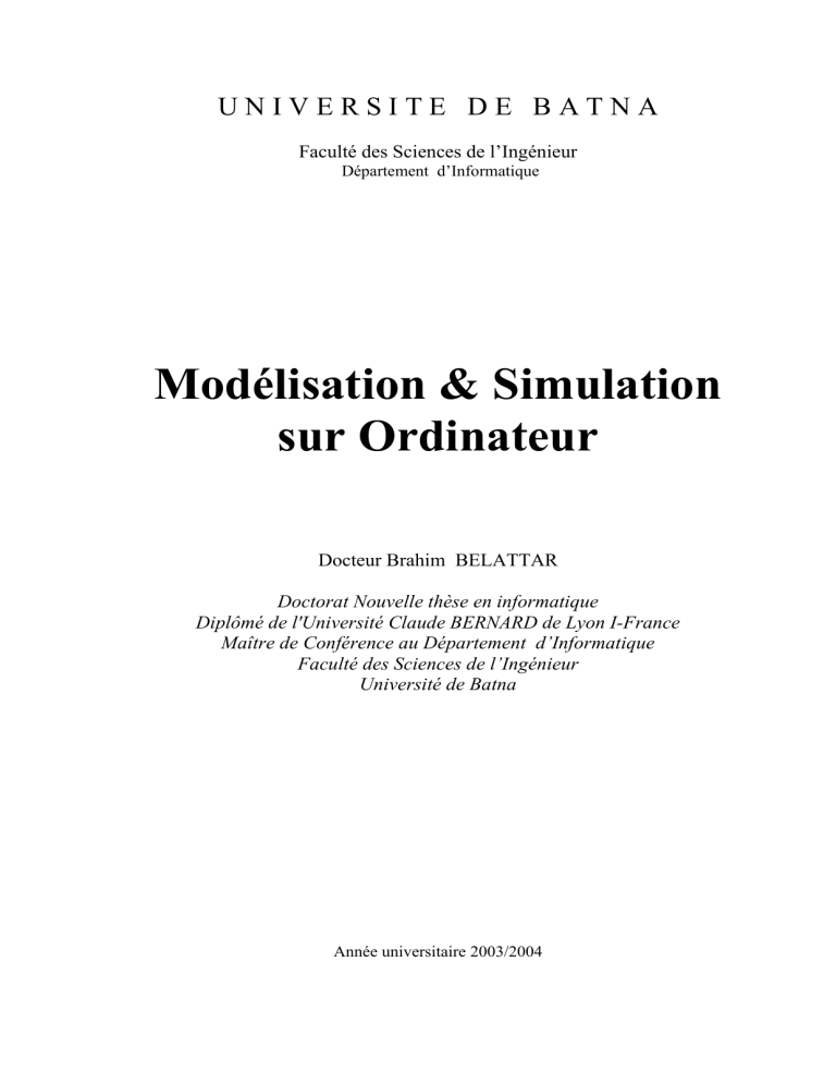 Dr Brahim BELATTAR. LISA. Département d'Informatique. Faculté des Sciences de l'Ingénieur. Université de Batna.