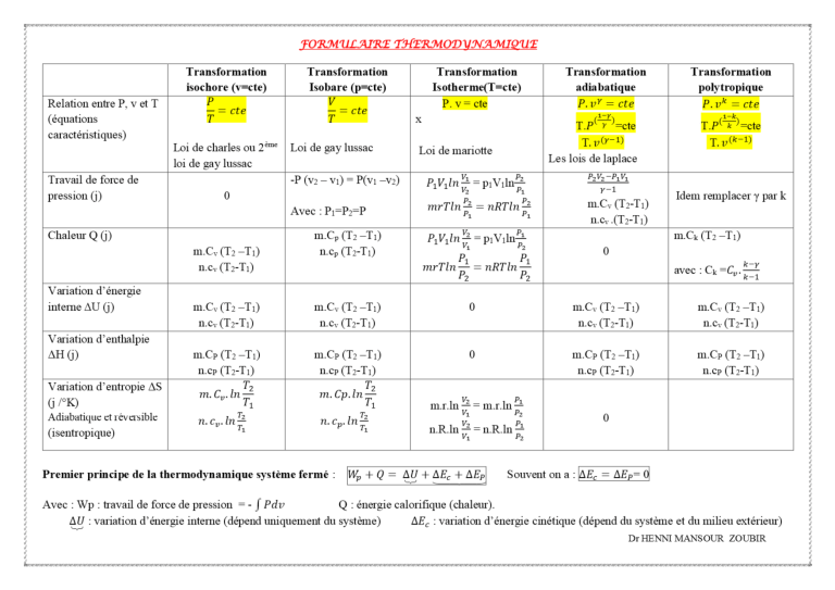 Fiche Formulaire de thermodynamique