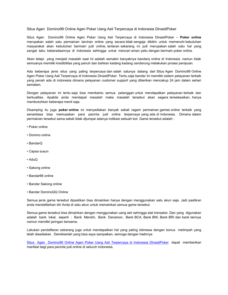 Situs Agen Domino99 Online Agen Poker Uang Asli Terpercaya di Indonesia DinastiPoker dapat memberikan