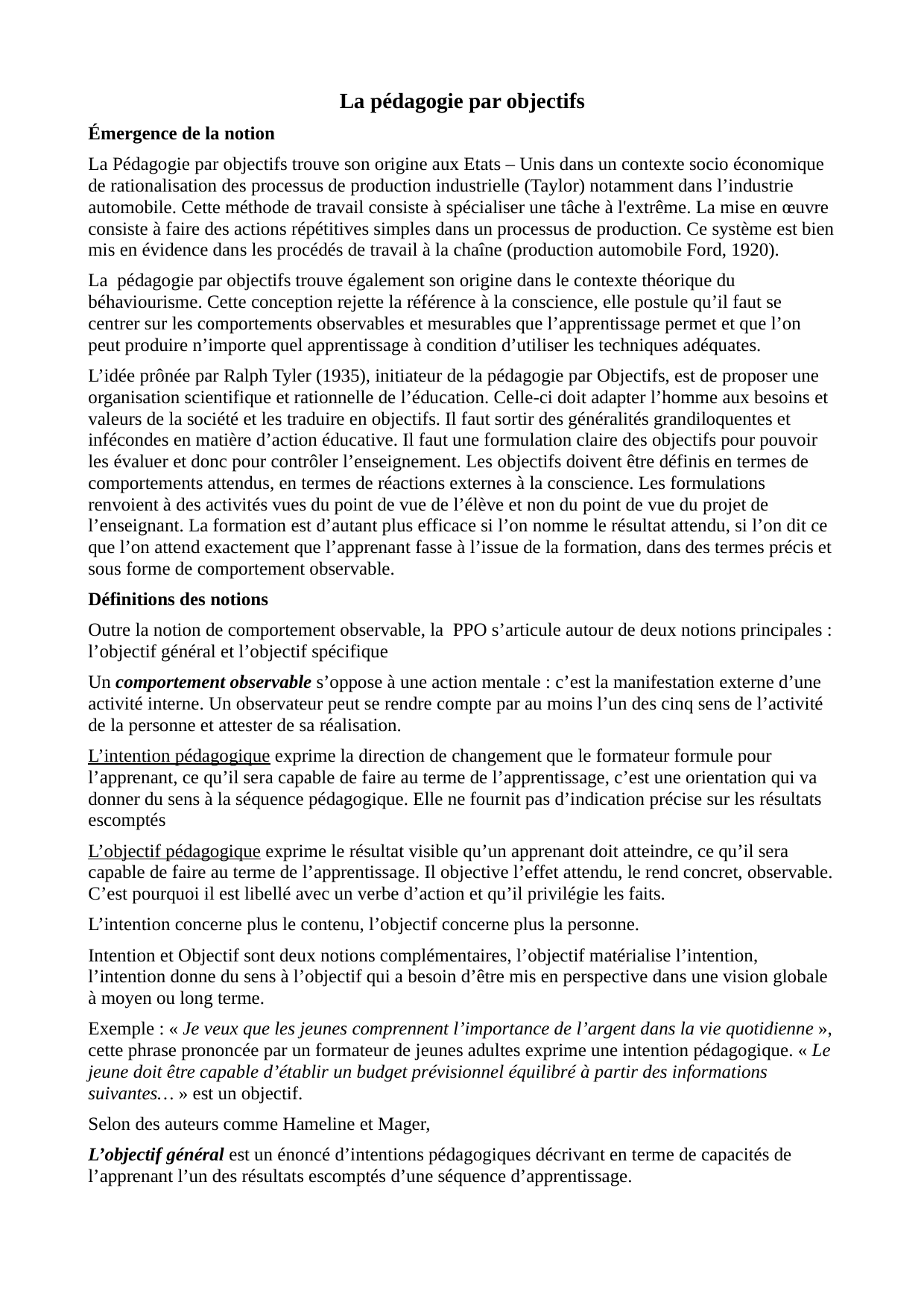 L’idée prônée par Ralph Tyler (1935), initiateur de la pédagogie par Objectifs, est de proposer une