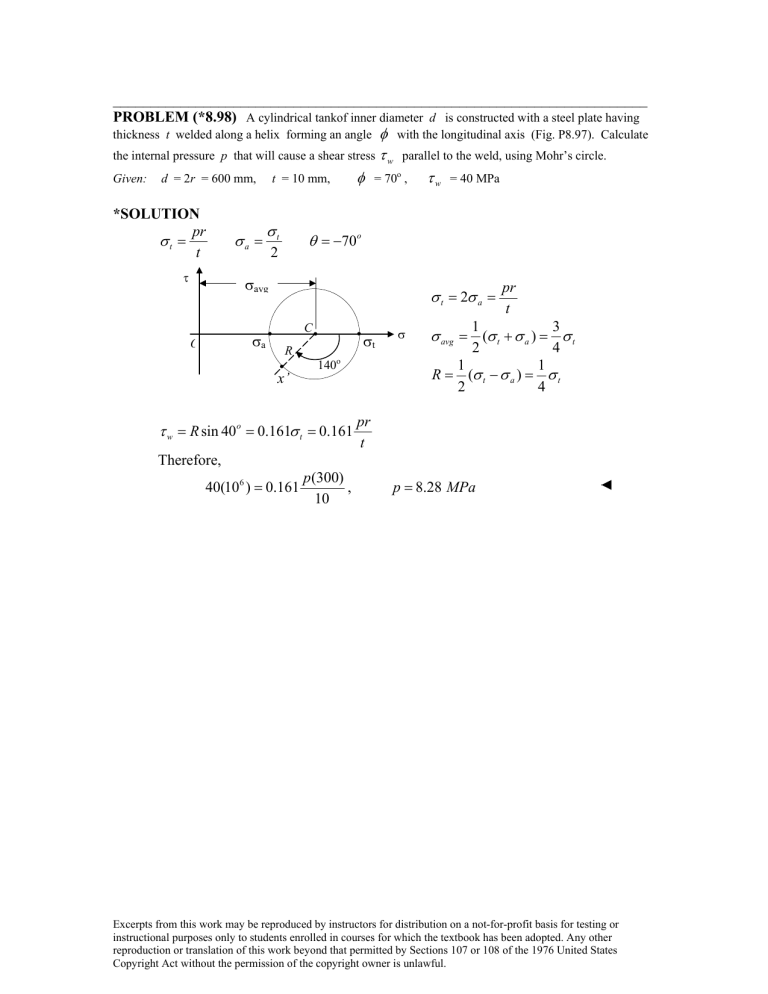 PROBLEM (*8.98) A cylindrical tankof inner diameter d is constructed with a steel plate having