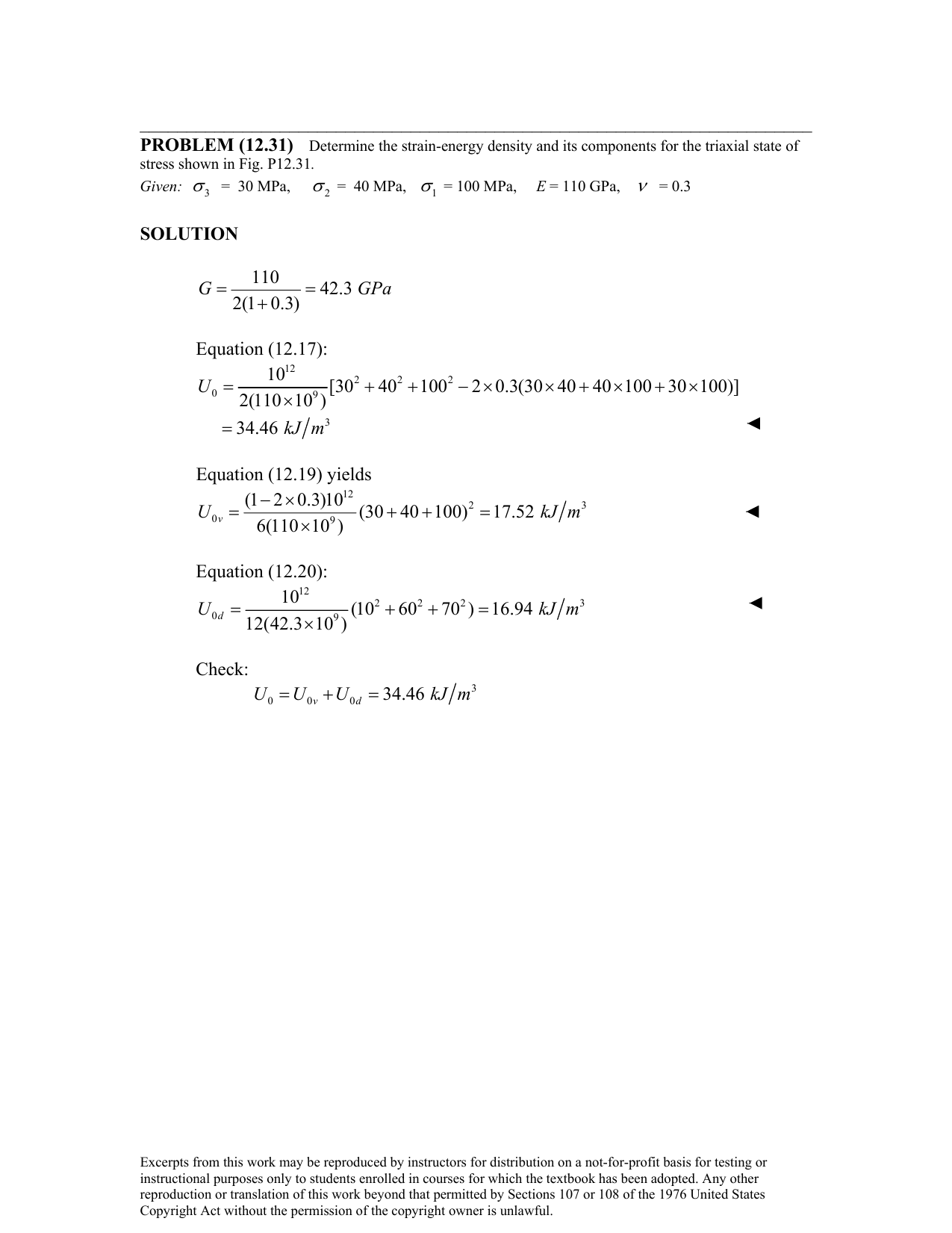 PROBLEM (12.31) Determine the strain-energy density and its components for the triaxial state of