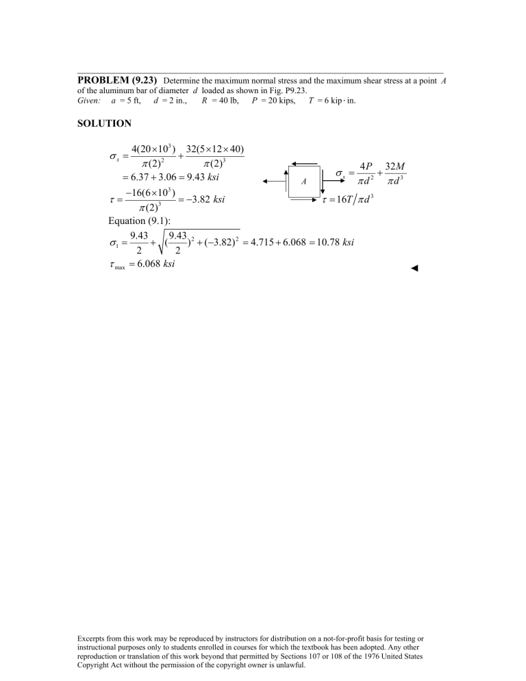 PROBLEM (9.23) Determine the maximum normal stress and the maximum shear stress at a point A