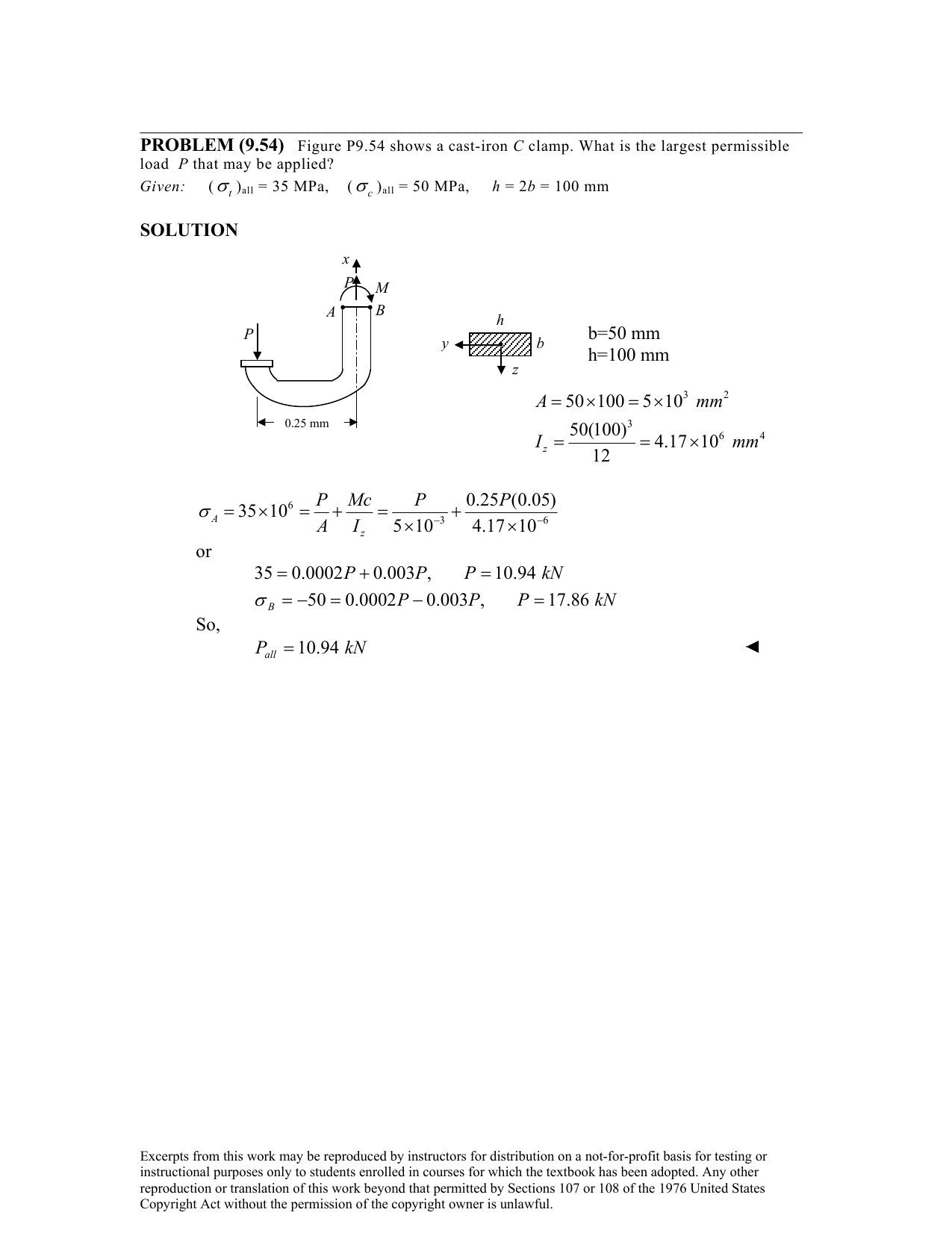 PROBLEM (9.54) Figure P9.54 shows a cast-iron C clamp. What is the largest permissible