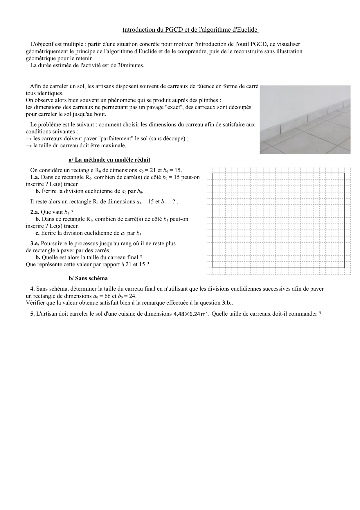 4. Sans schéma, déterminer la taille du carreau final en n'utilisant que les divisions euclidiennes successives afin de paver