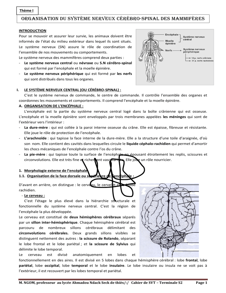 ORGANISATION DU SYSTÈME NERVEUX CÉRÉBRO-SPINAL DES mammifères