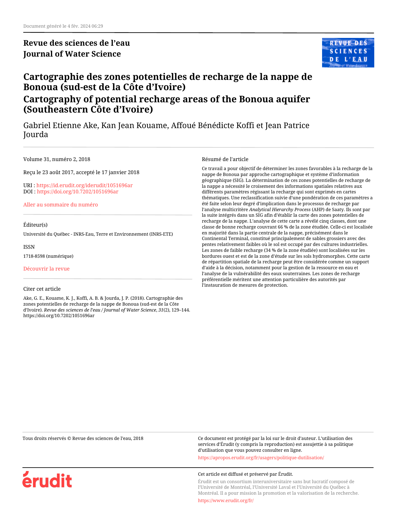 Cartographie Recharge Nappe Bonoua, Côte d'Ivoire