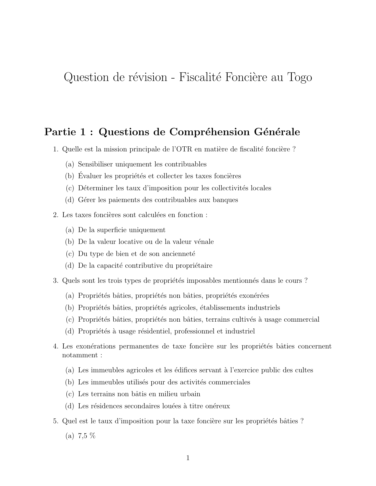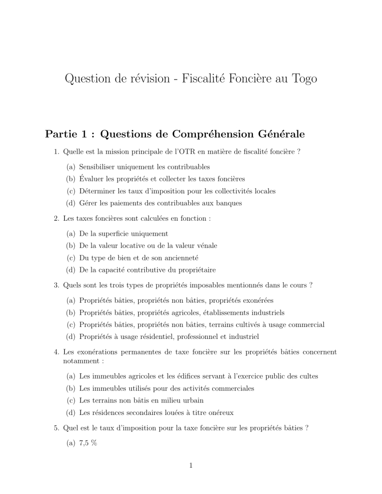 Question de r´evision - Fiscalit´e Fonci`ere au Togo