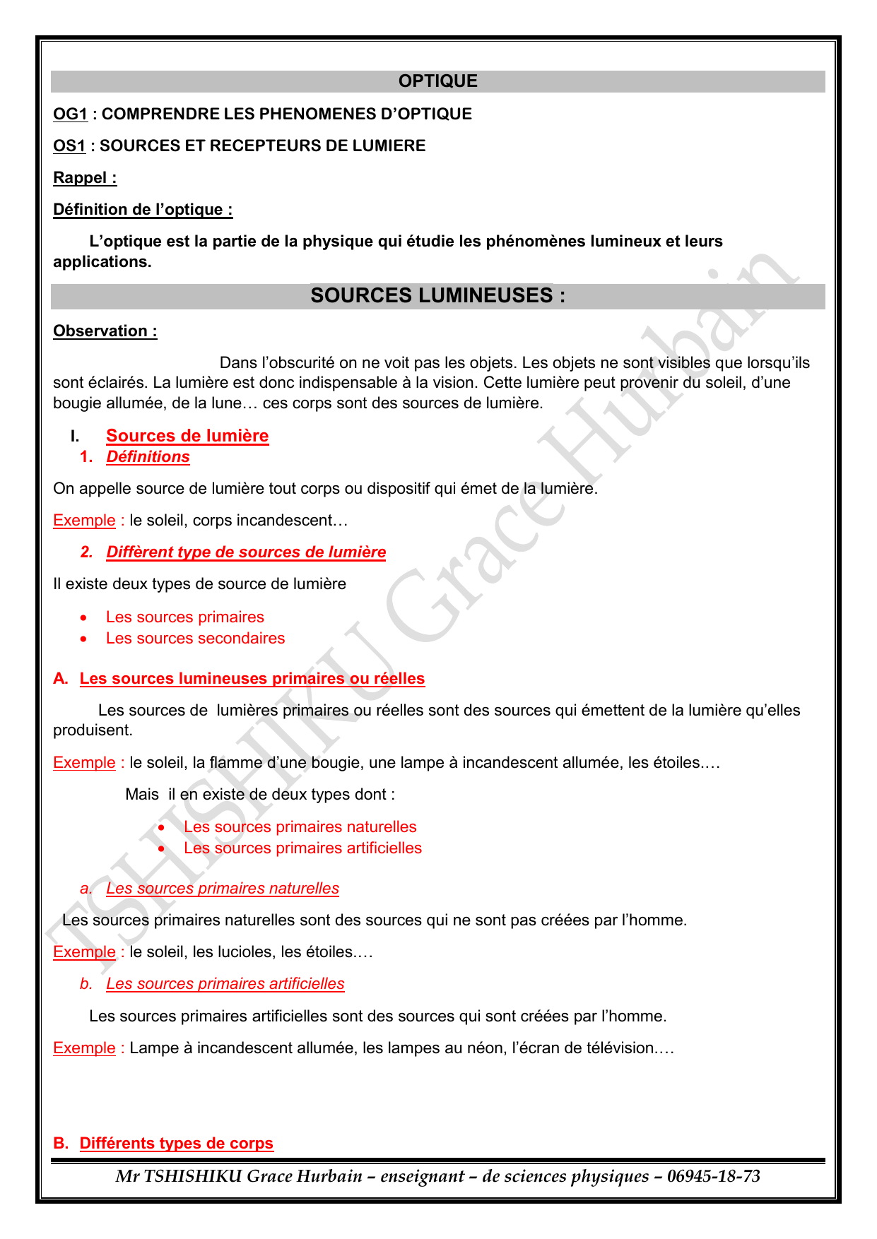 OS1 : SOURCES ET RECEPTEURS DE LUMIERE