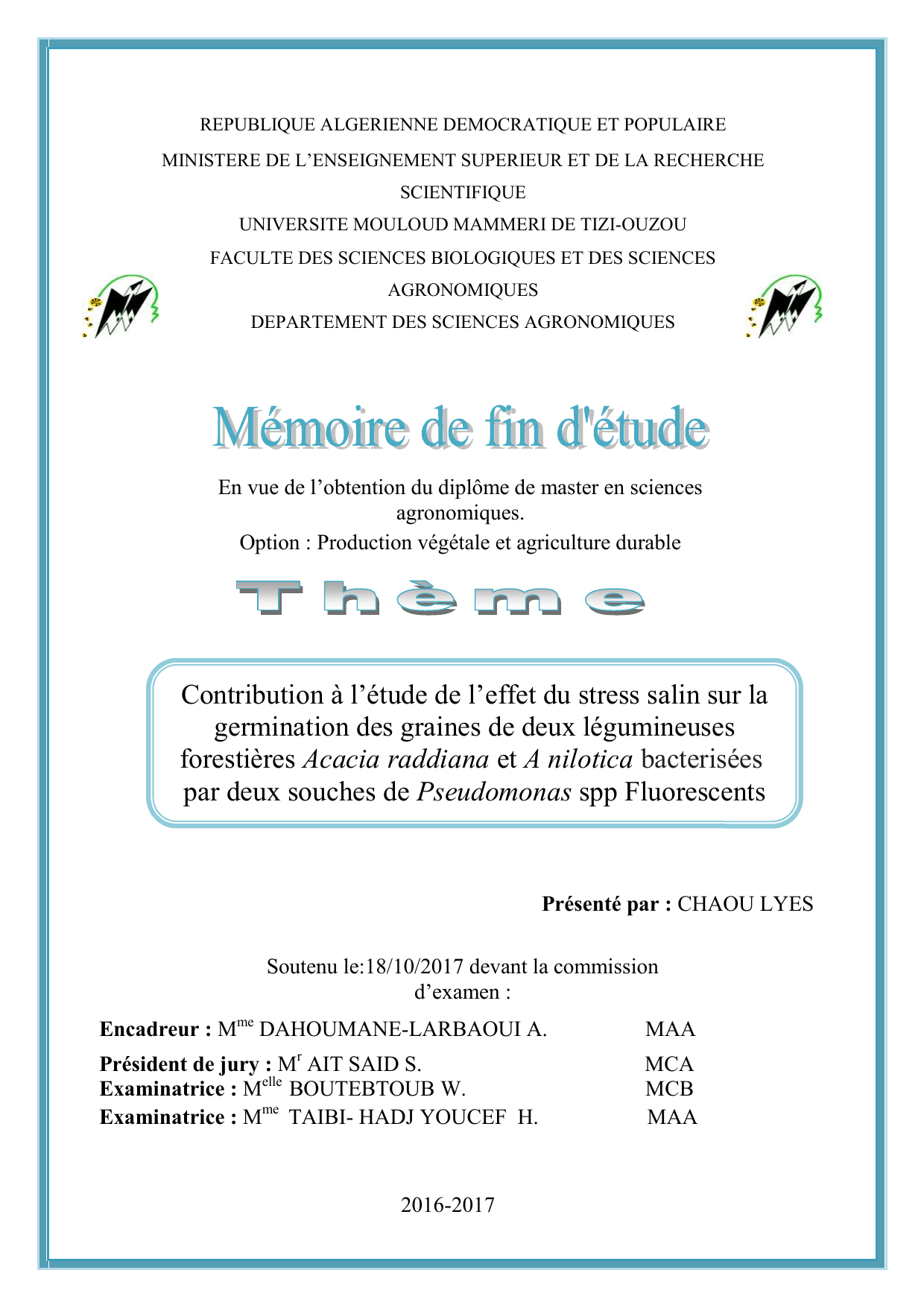 Encadreur : Mme DAHOUMANE-LARBAOUI A. MAA