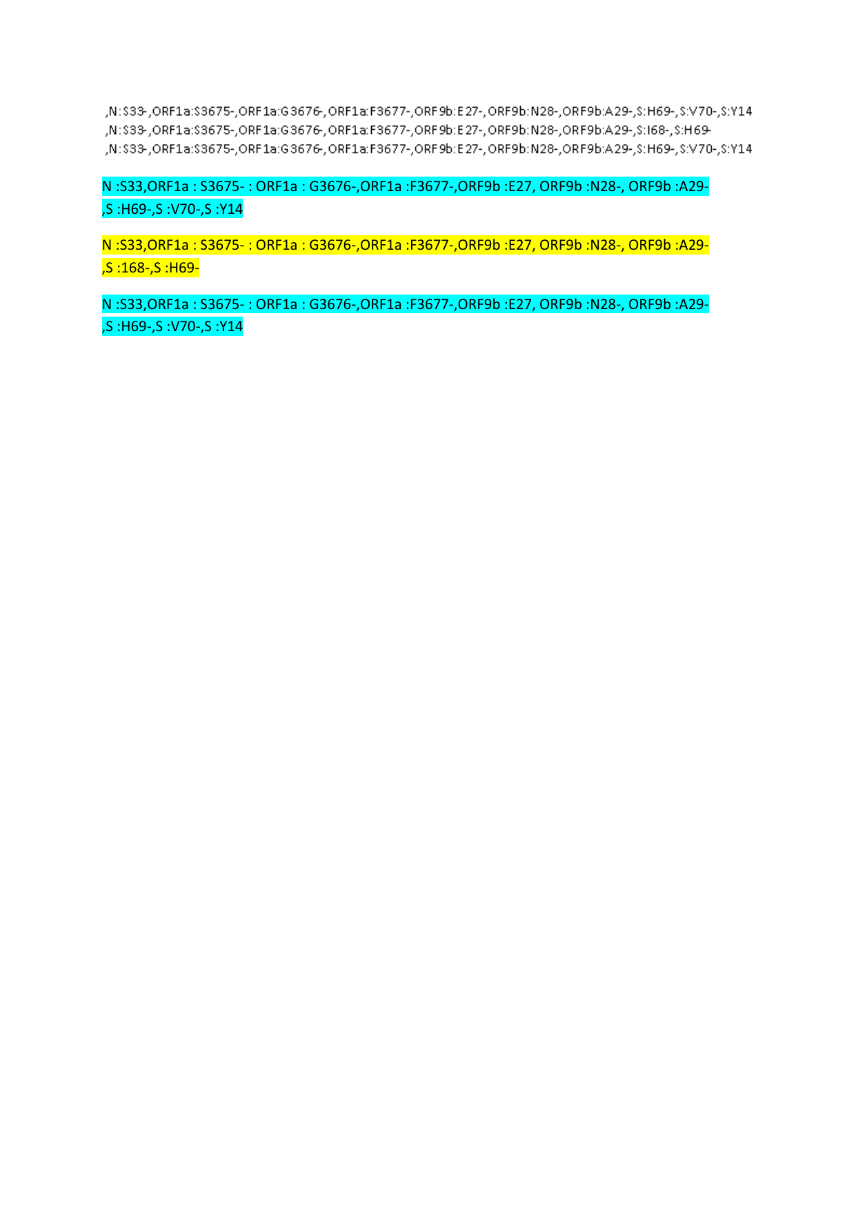 N :S33,ORF1a : S3675- : ORF1a : G3676-,ORF1a :F3677-,ORF9b :E27, ORF9b :N28-, ORF9b :A29-