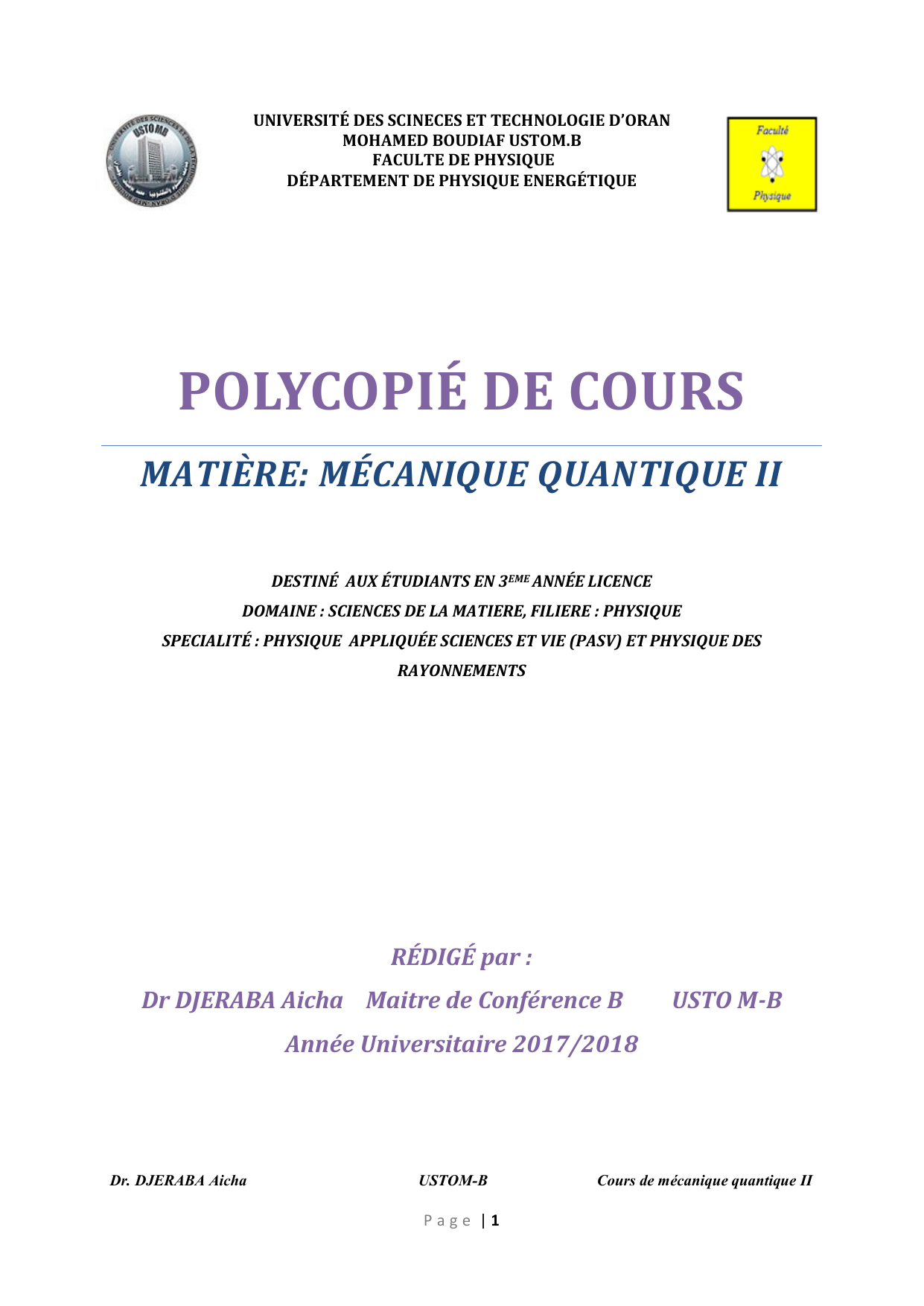 Dr. DJERABA Aicha USTOM-B Cours de mécanique quantique II