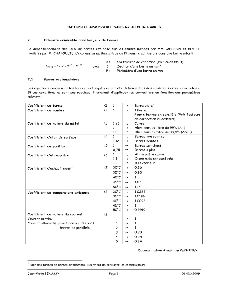INTENSITES ADMISSIBLES en AMPERES dans les