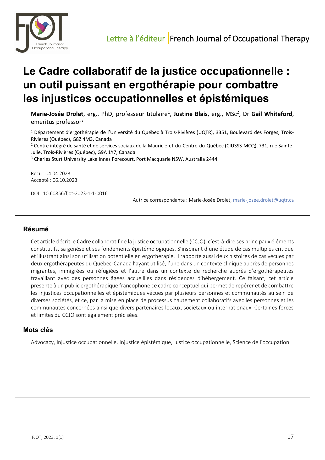 Lettre à l’éditeur French Journal of Occupational Therapy