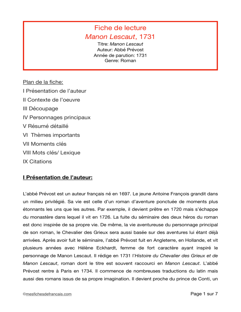 Première partie: Le texte de Manon Lescaut débute par un#Avis de l’auteur sous-titré