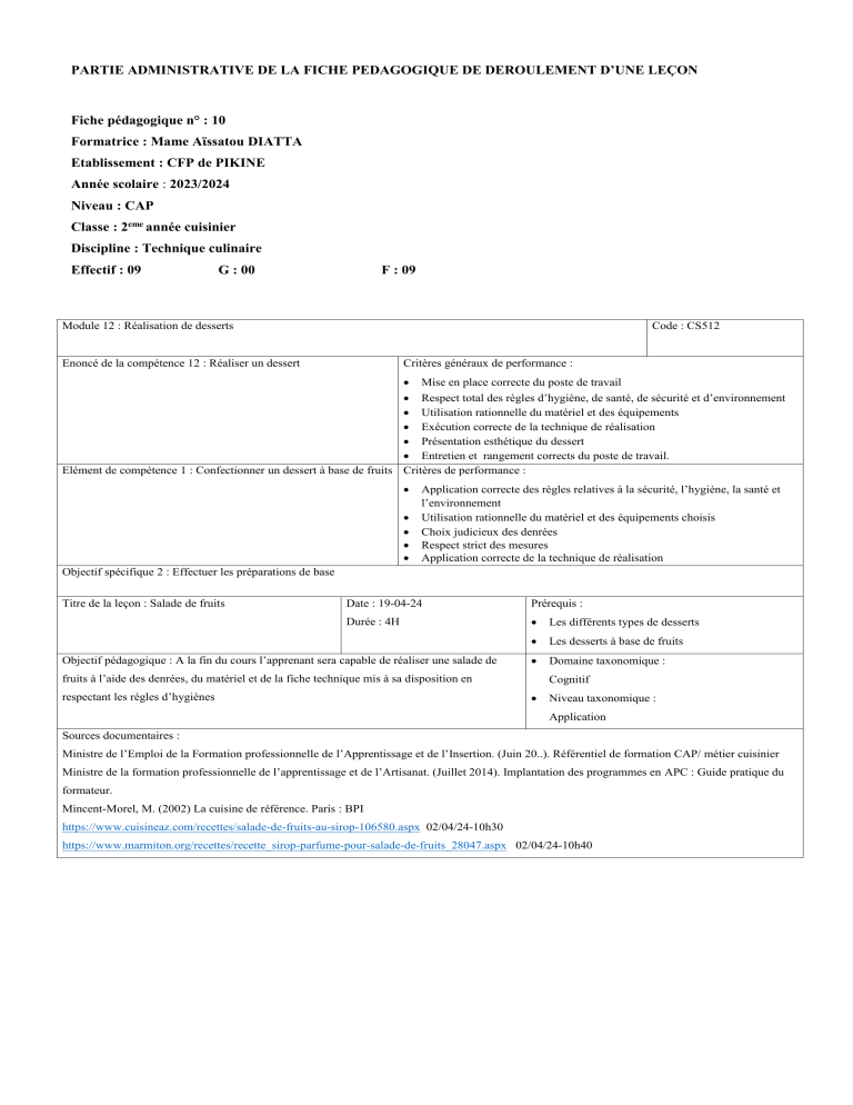 PARTIE ADMINISTRATIVE DE LA FICHE PEDAGOGIQUE DE DEROULEMENT D’UNE LEÇON