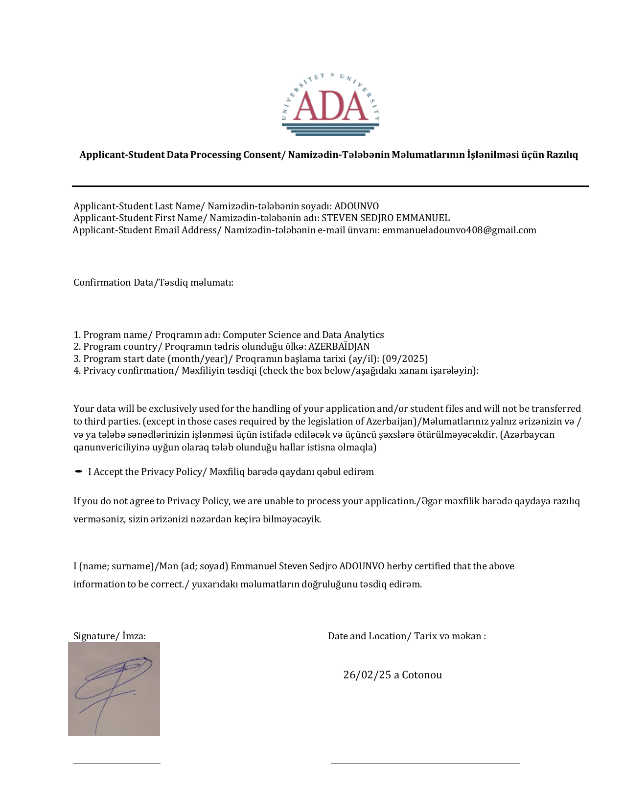 I (name; surname)/Mən (ad; soyad) Emmanuel Steven Sedjro ADOUNVO herby certified that the above
