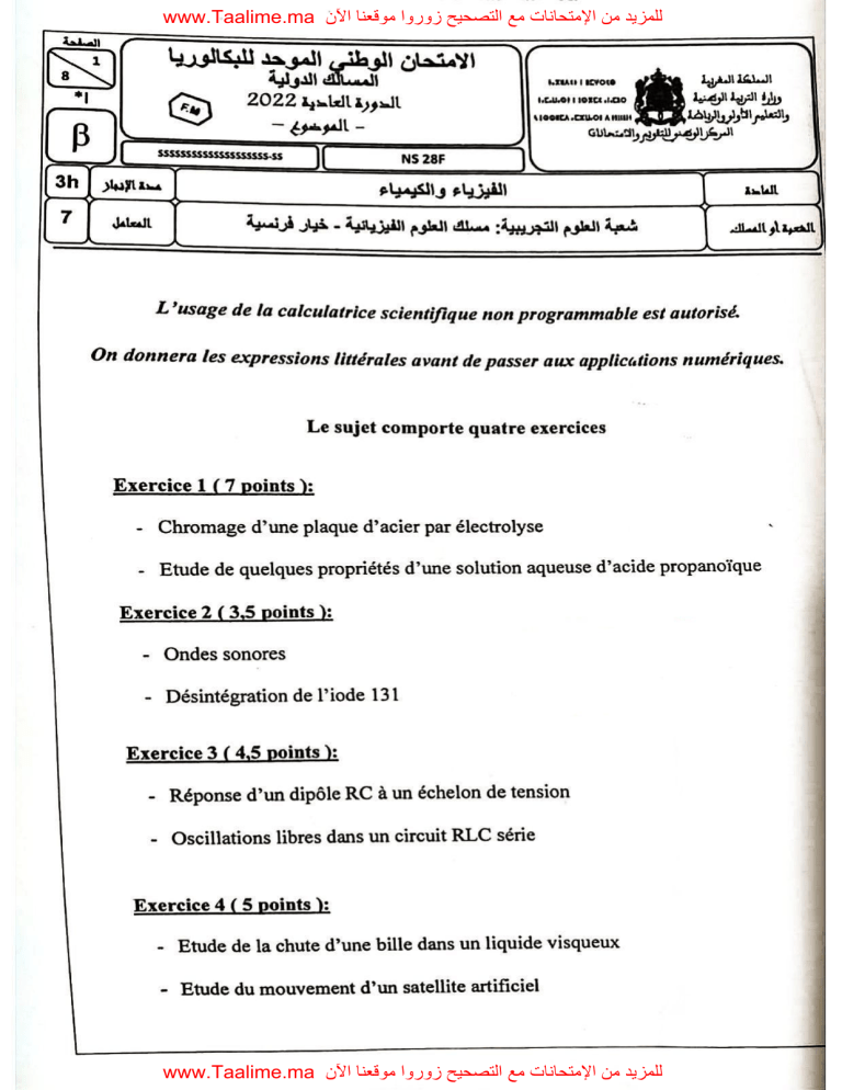 Examen Physique-Chimie Bac International 2022