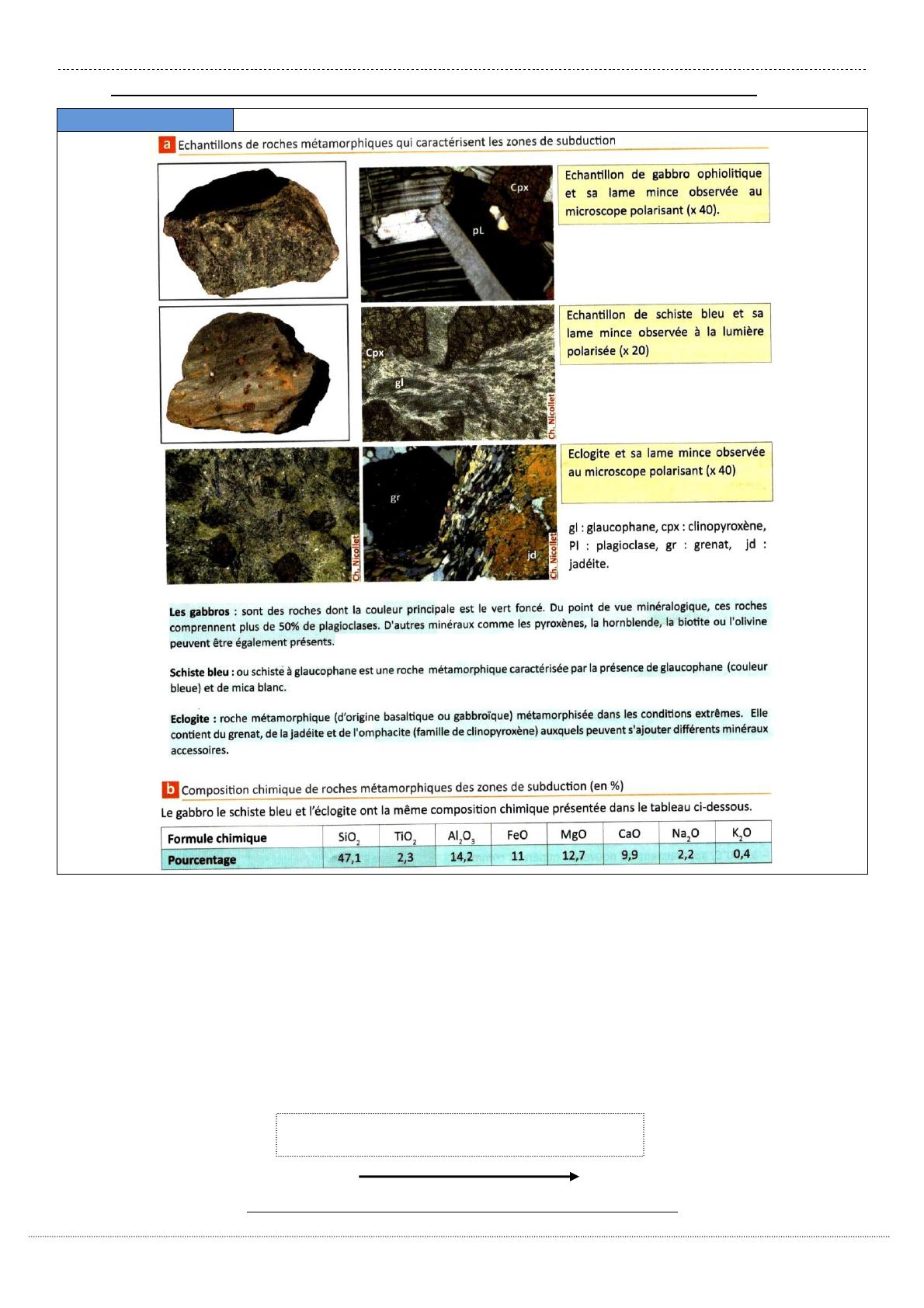 la présence de glaucophane et grenat dans cette roche indique qu’elle a une facies métamorphique de