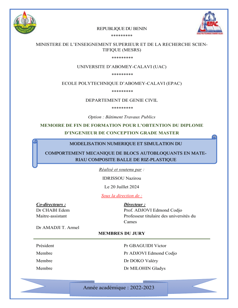 Mémoire : Modélisation Blocs Auto-bloquants Riz-Plastique