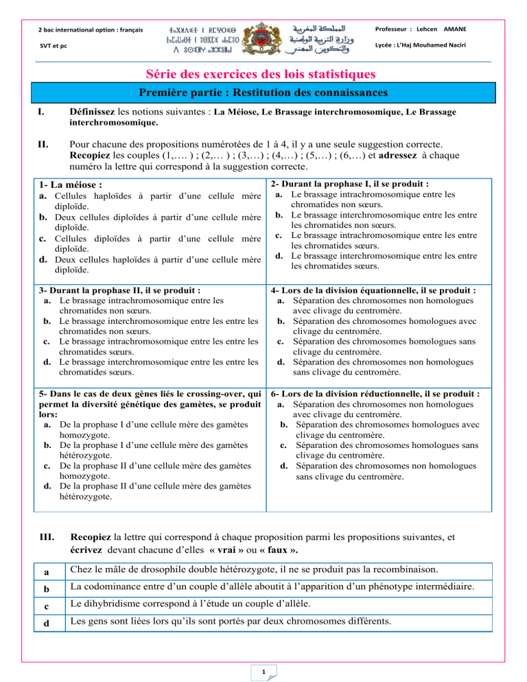 3- Montrez le rôle du brassage chromosomique dans la diversité génétique des gamètes produits lors du