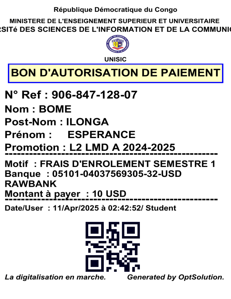 Motif : FRAIS D'ENROLEMENT SEMESTRE 1