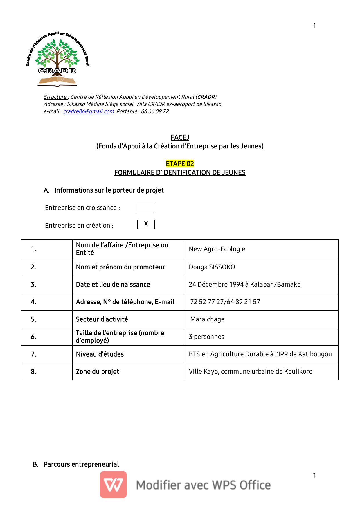 a) Quelle est le parcours entrepreneurial du porteur de projet ?