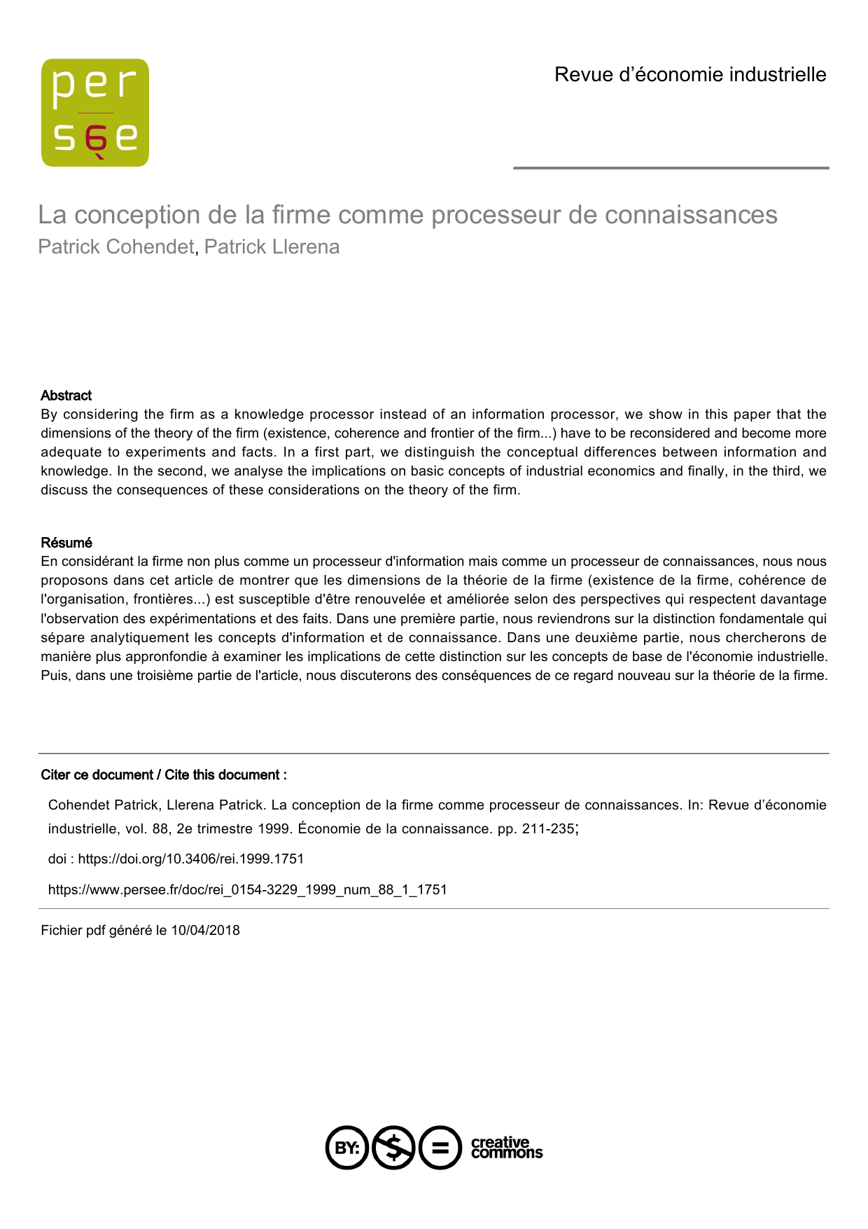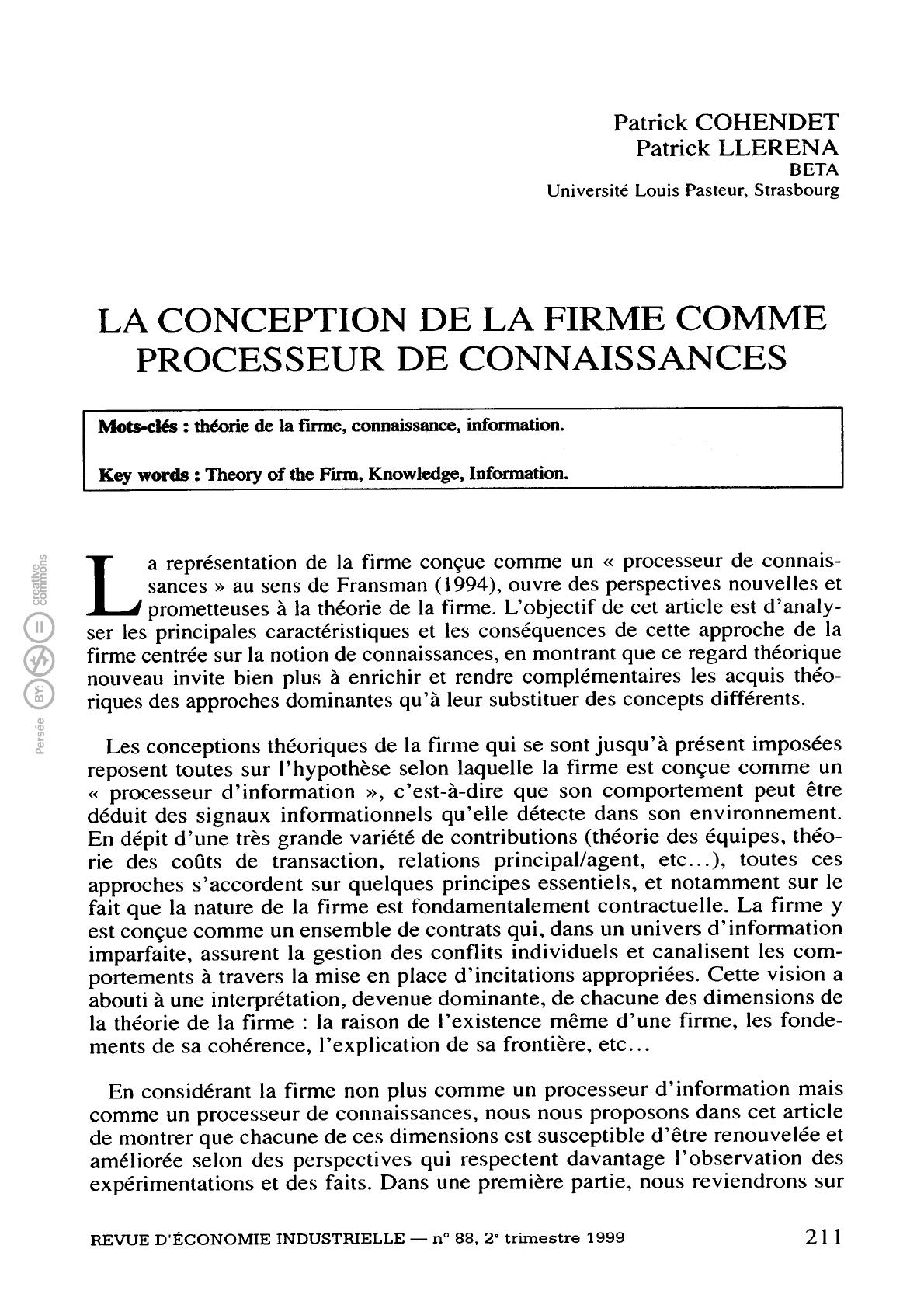 Cohendet Patrick, Llerena Patrick. La conception de la firme comme processeur de connaissances. In: Revue d’économie