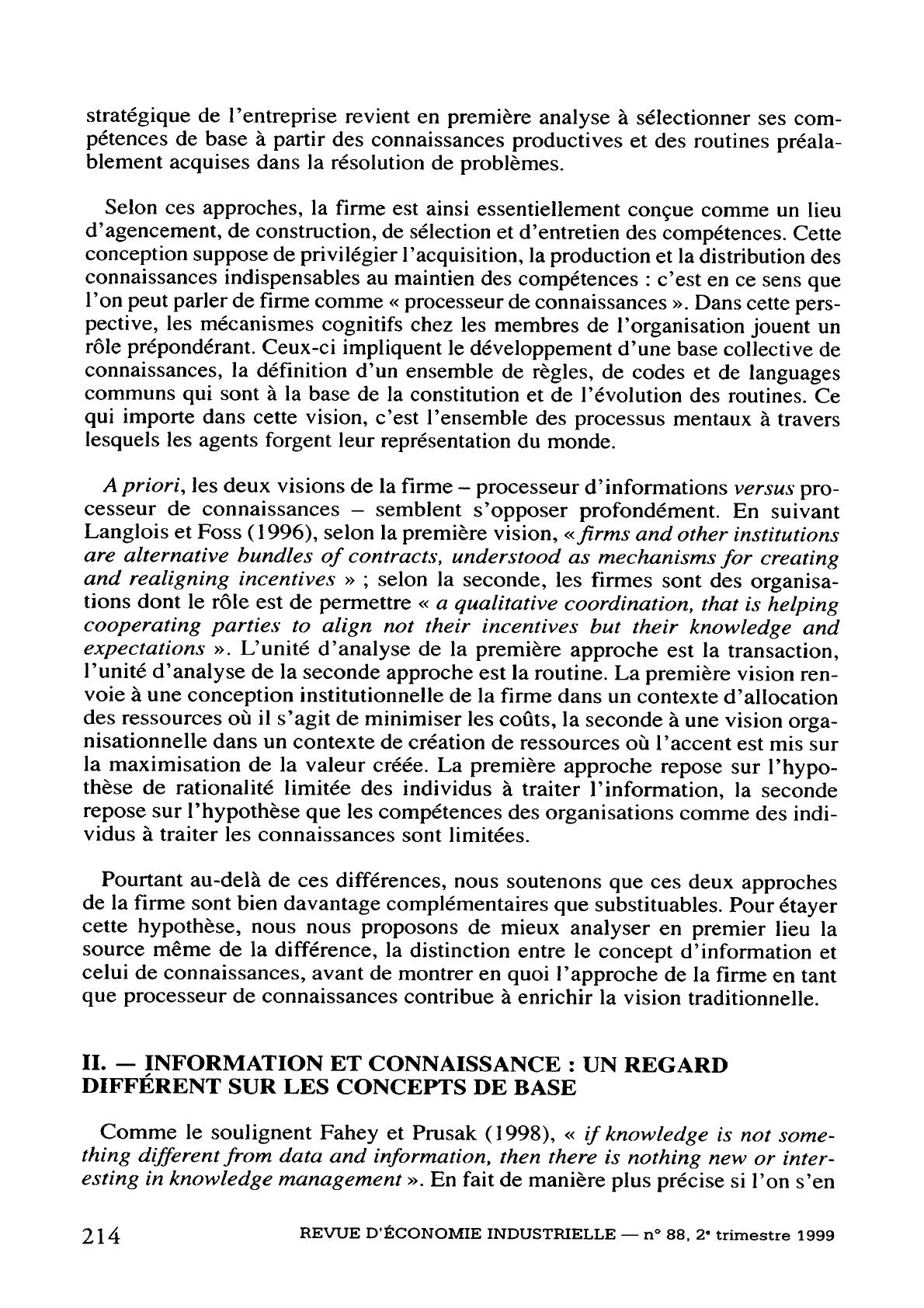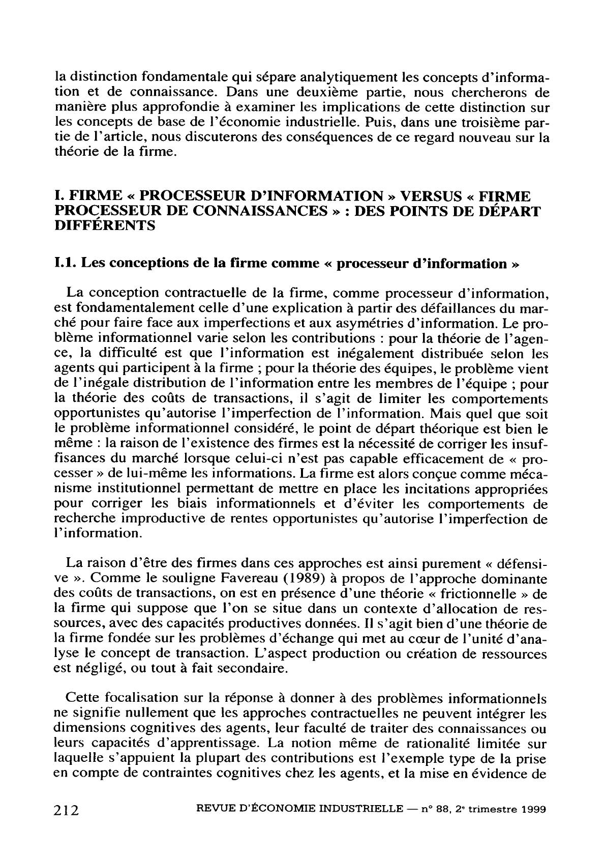En considérant la firme non plus comme un processeur d'information mais comme un processeur de connaissances, nous nous