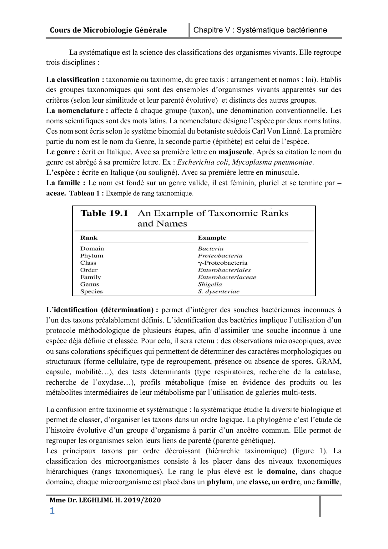 domaine, chaque microorganisme est placé dans un phylum, une classe, un ordre, une famille,