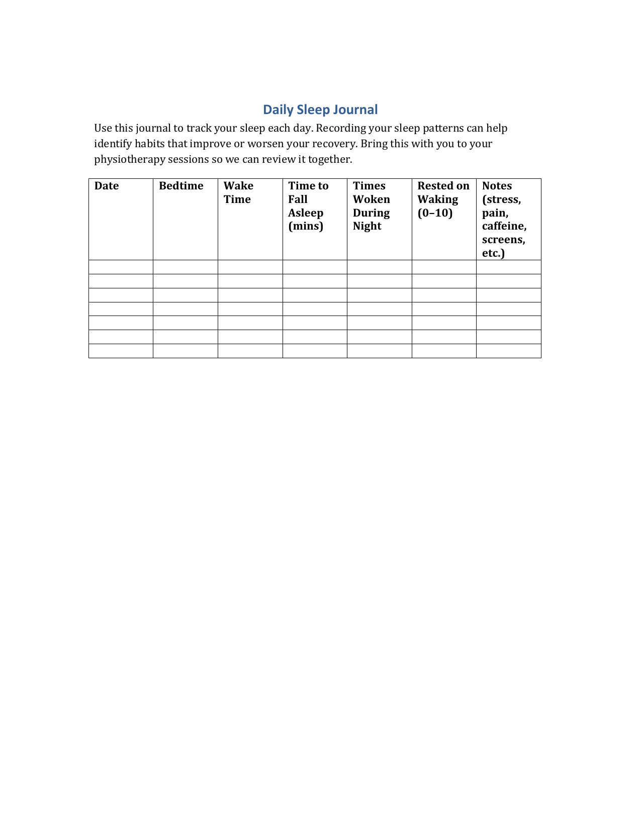 Use this journal to track your sleep each day. Recording your sleep patterns can help