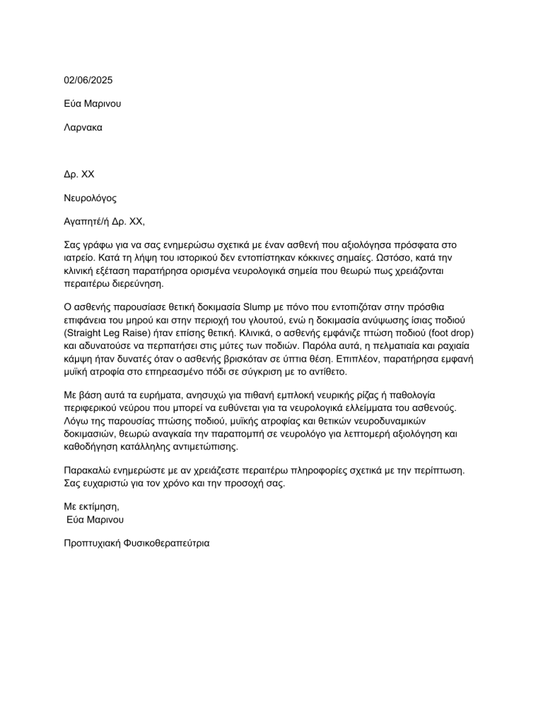 δοκιμασιών, θεωρώ αναγκαία την παραπομπή σε νευρολόγο για λεπτομερή αξιολόγηση και