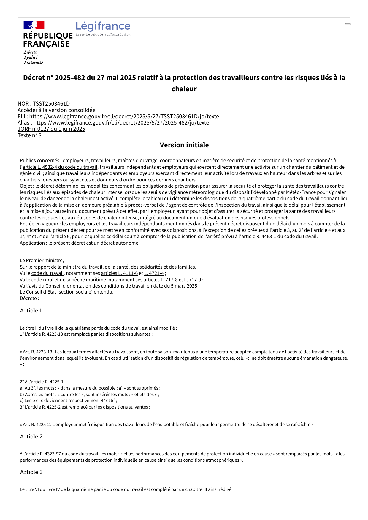 « Art. R. 4463-7. - Lors de la survenue des épisodes de chaleur intense, l'employeur met en œuvre les mesures ou les actions de prévention définies en application
