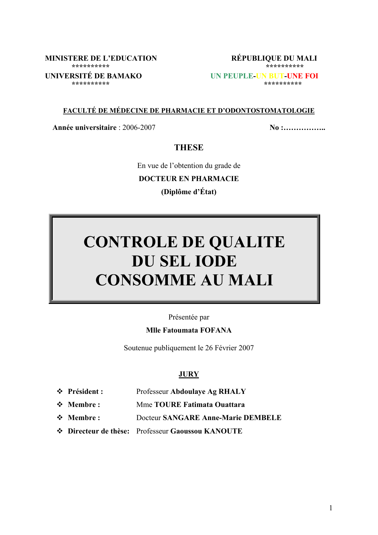 UNIVERSITÉ DE BAMAKO UN PEUPLE-UN BUT-UNE FOI