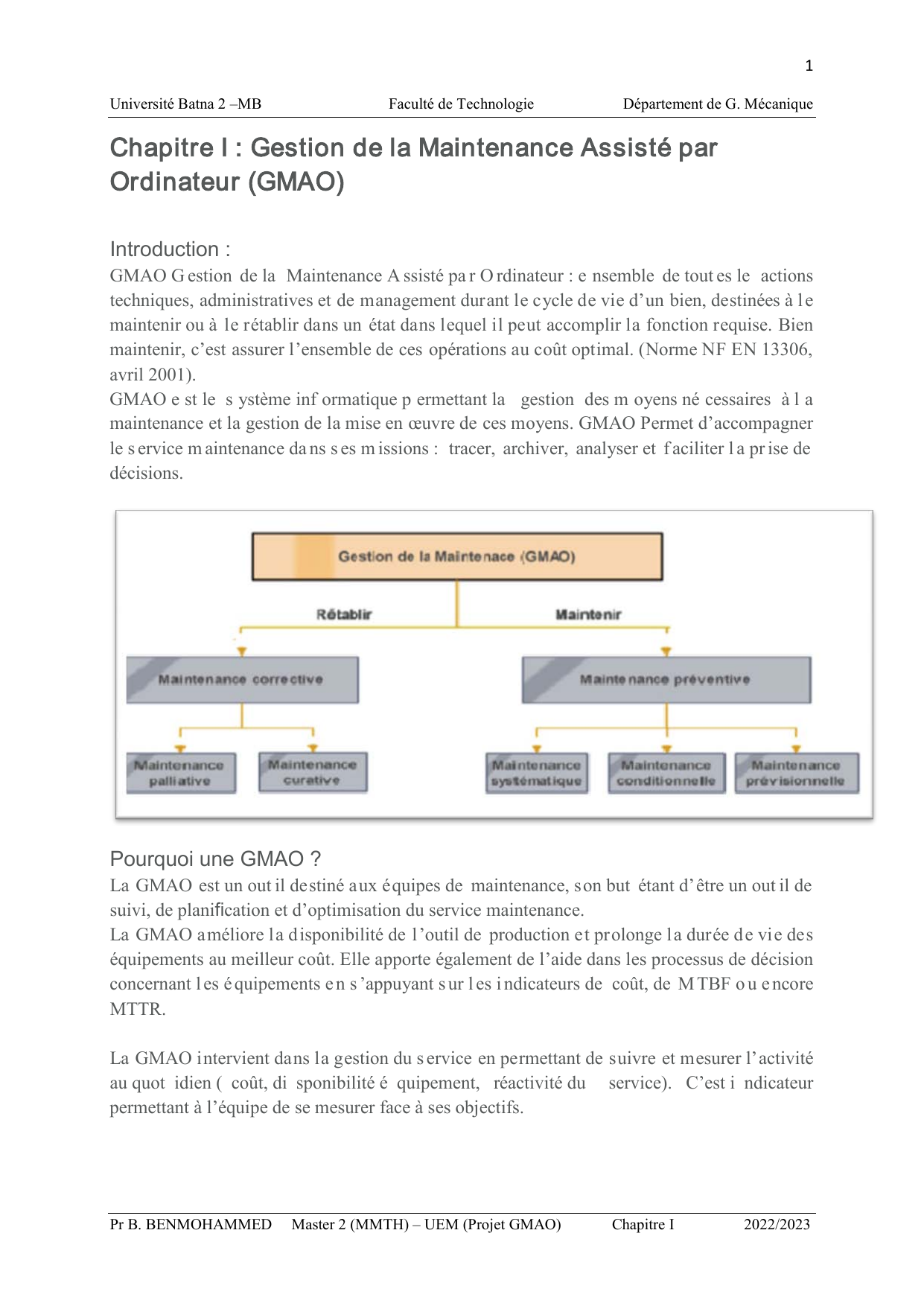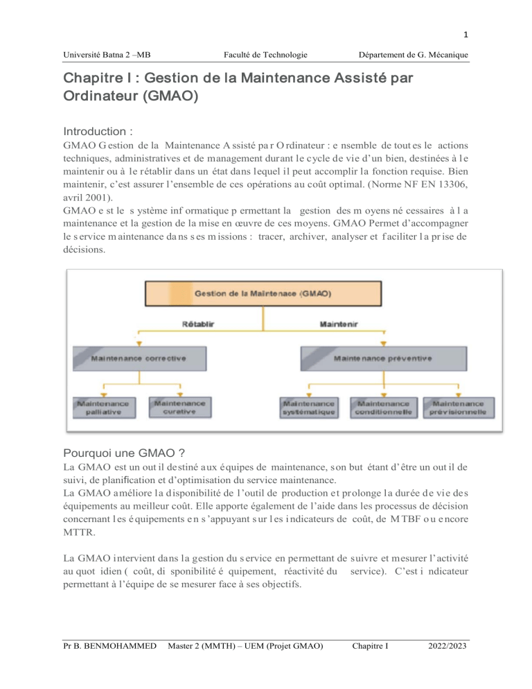 Pr B. BENMOHAMMED Master 2 (MMTH) – UEM (Projet GMAO) Chapitre I 2022/2023