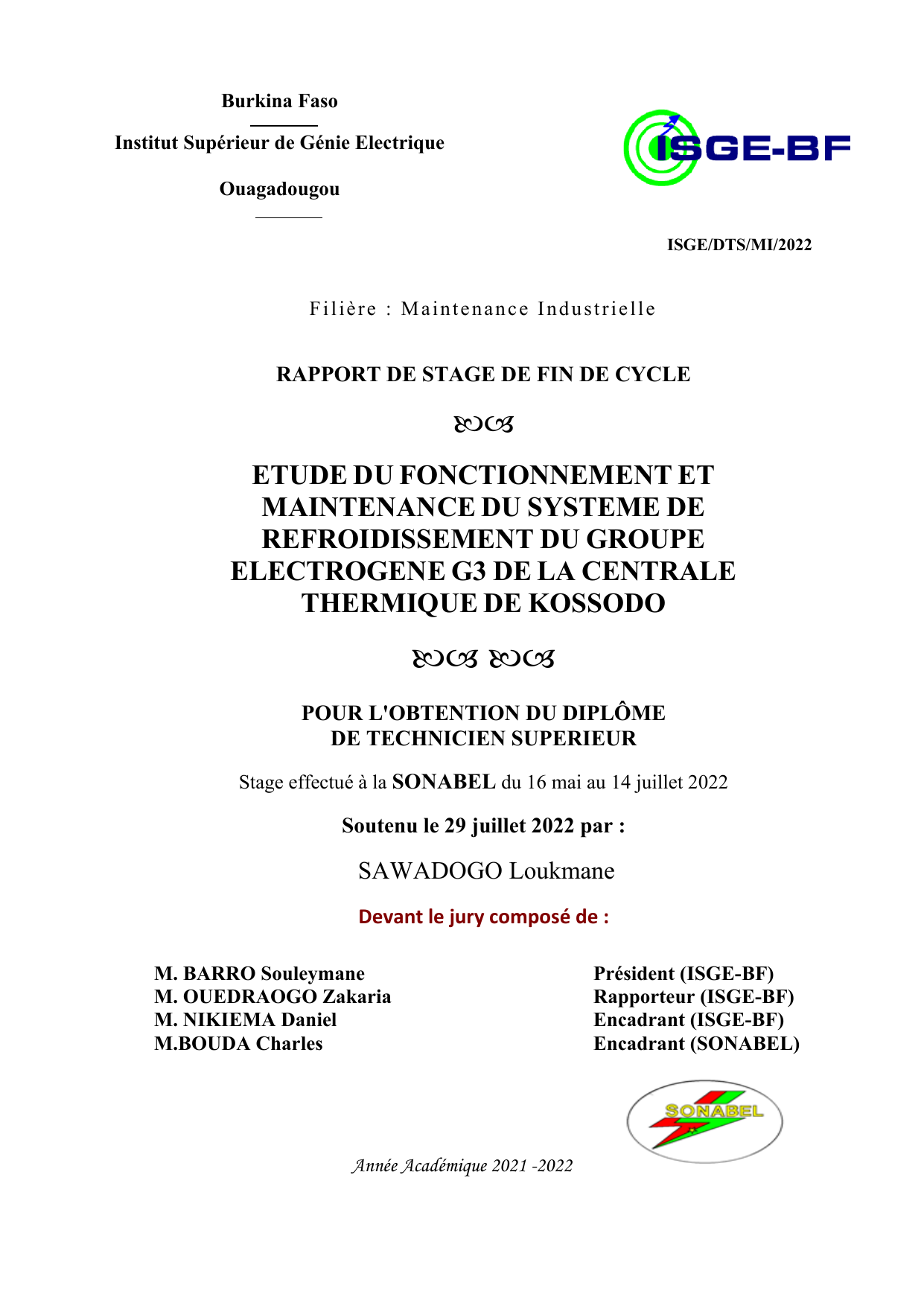 ETUDE DU FONCTIONNEMENT ET MAINTENANCE DU SYSTEME DE REFROIDISSEMENT DU GROUPE ELECTROGENE G3 DE KOSSODO