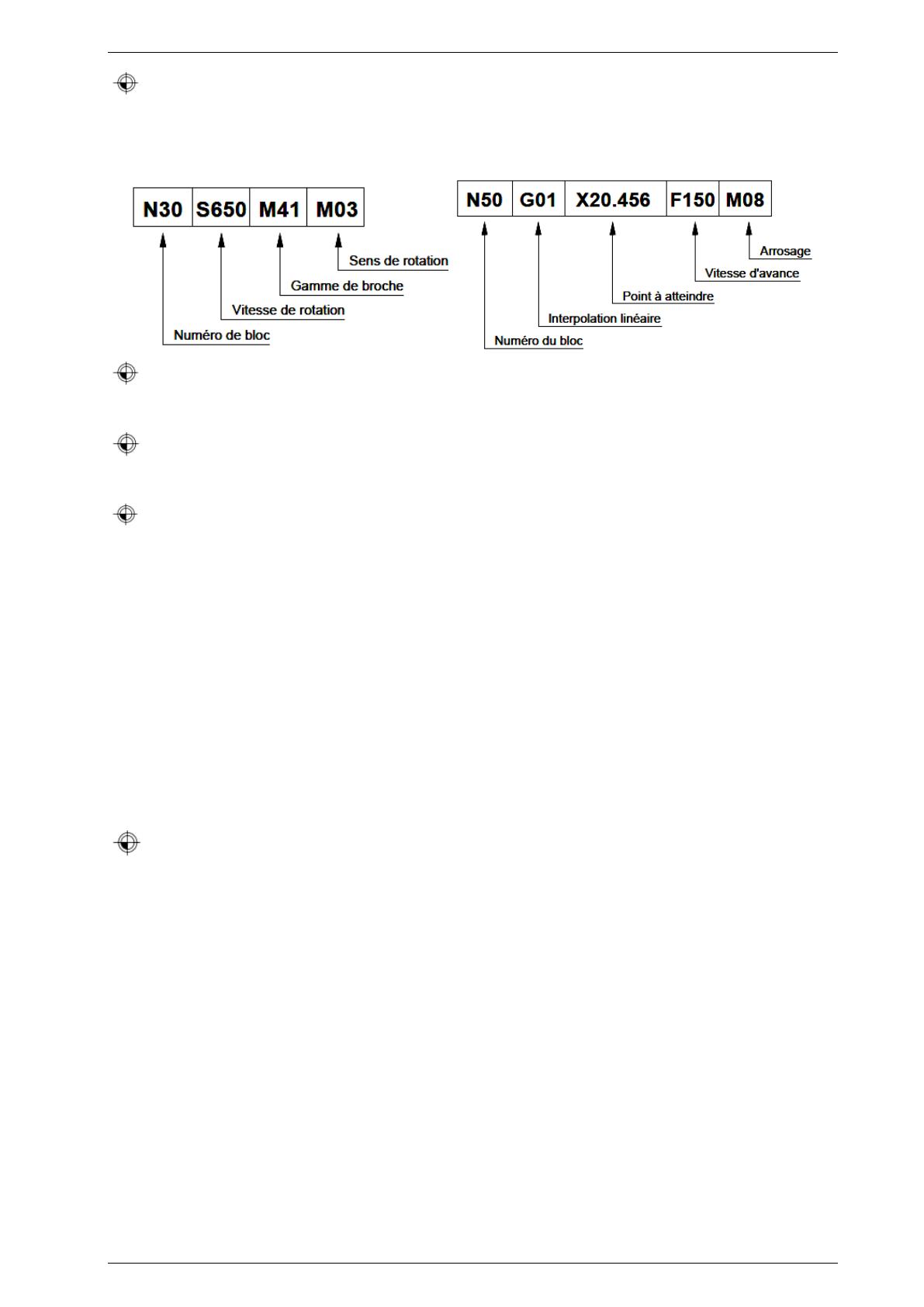 S... : précise la vitesse de coupe ou la vitesse de rotation de la broche.