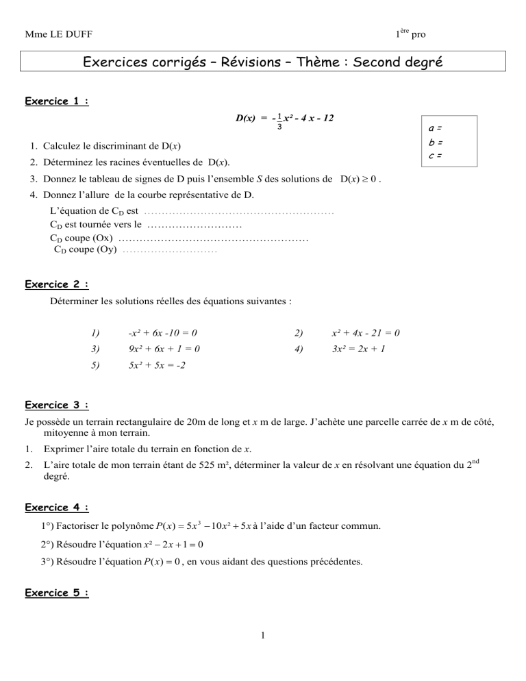 Exercices corrigés – Révisions – Thème : Second degré