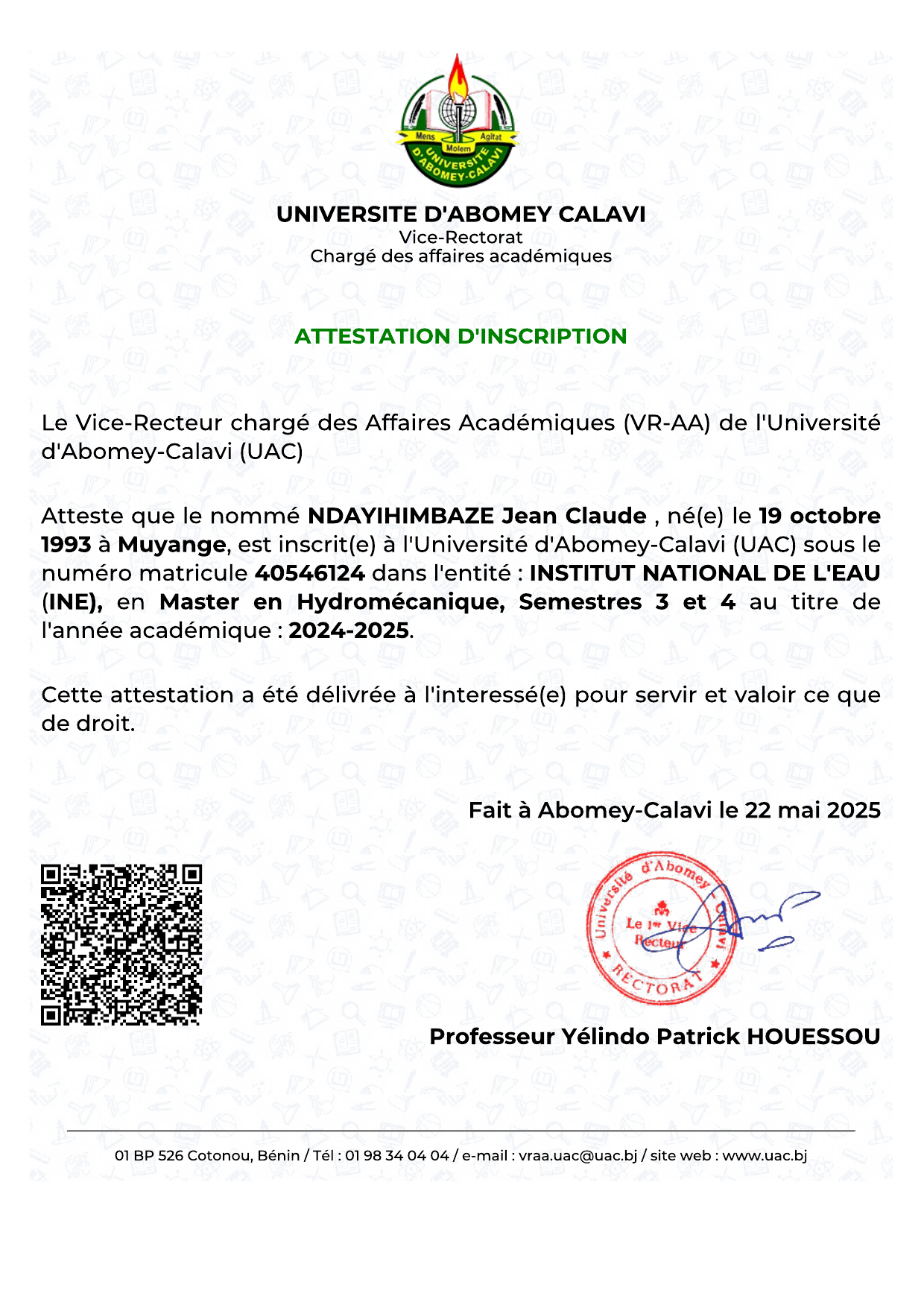 Attestation d'Inscription - Université d'Abomey-Calavi