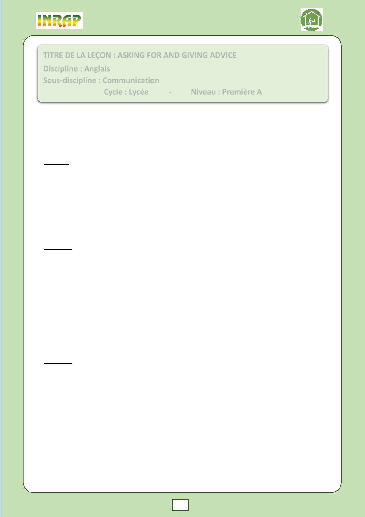 TITRE DE LA LEÇON : ASKING FOR AND GIVING ADVICE