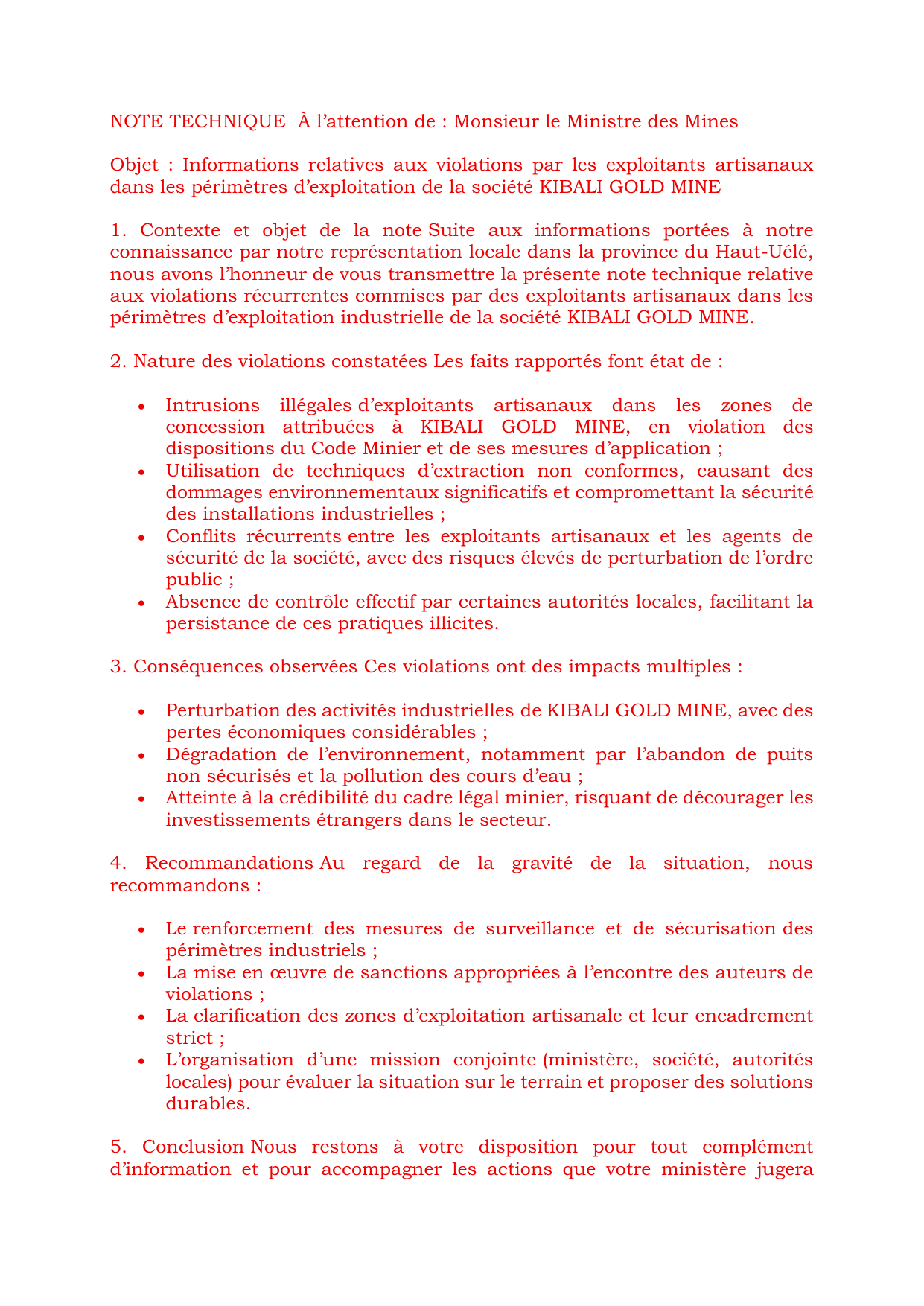 Violations minières artisanales KIBALI GOLD MINE: Note Technique au Ministre