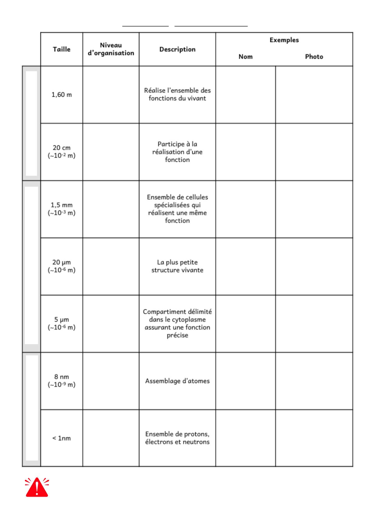 1.Enumérer les niveaux d’organisation du vivant par ordre de grandeur décroissant.