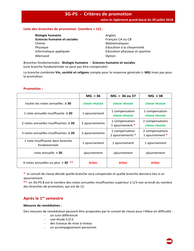 Critères de promotion 3G-PS - Règlement scolaire Luxembourg 2018