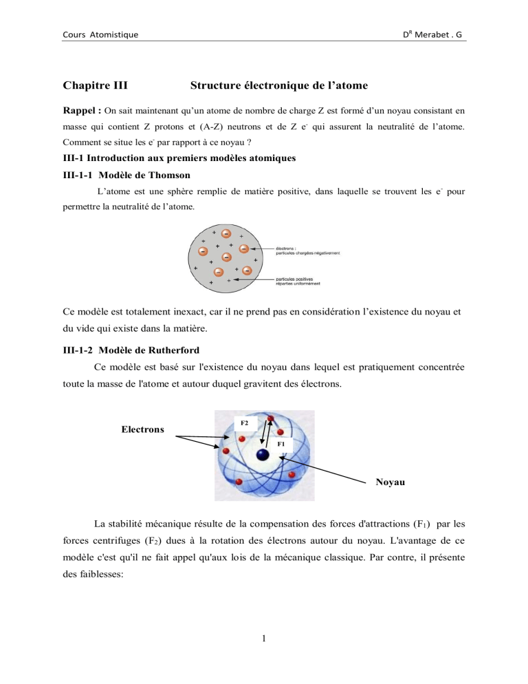 Cours Atomistique : Chapitre III - Structure Électronique de l'Atome