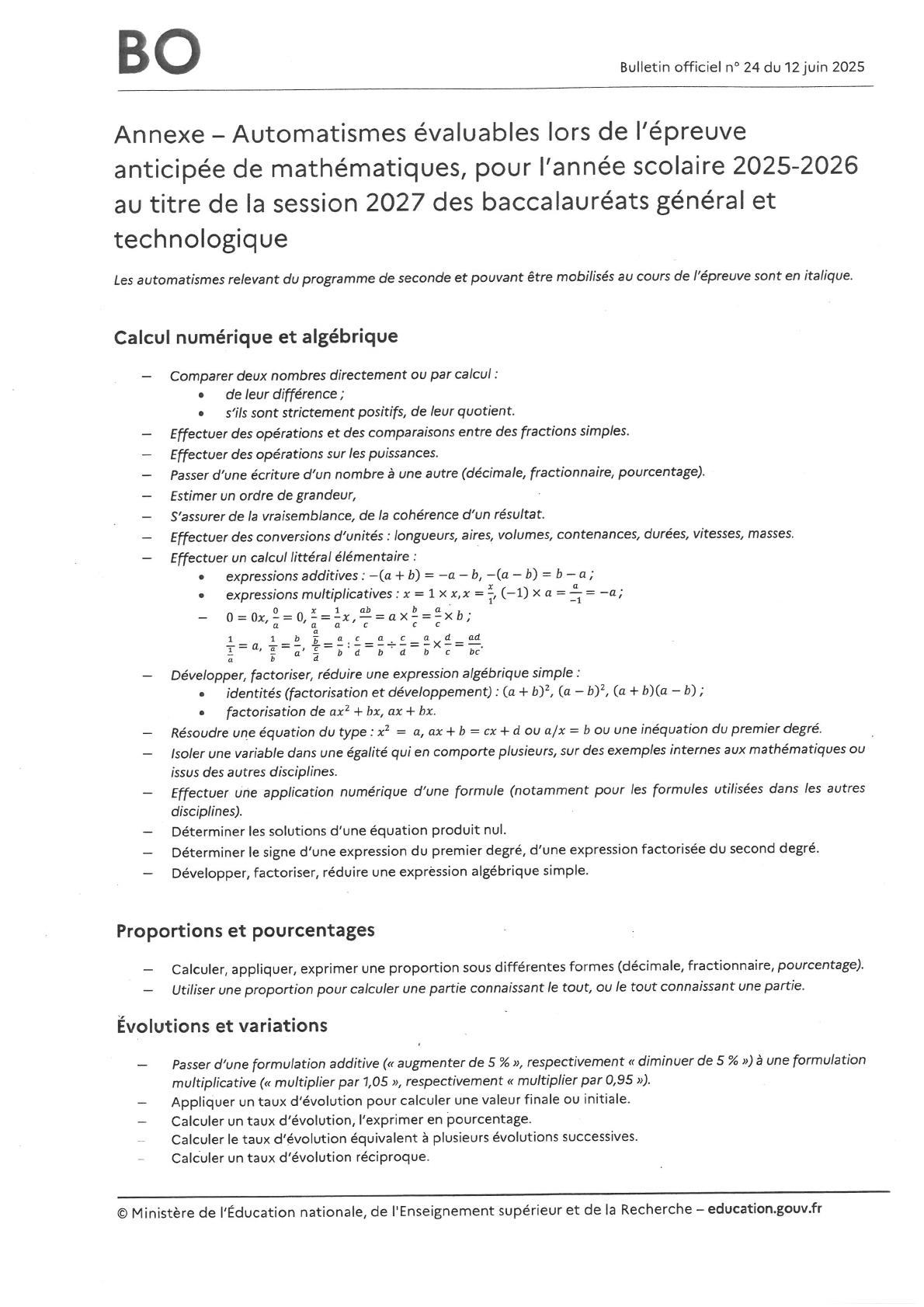 Automatismes Maths Bac 2027: Programme Épreuve Anticipée 2025-2026