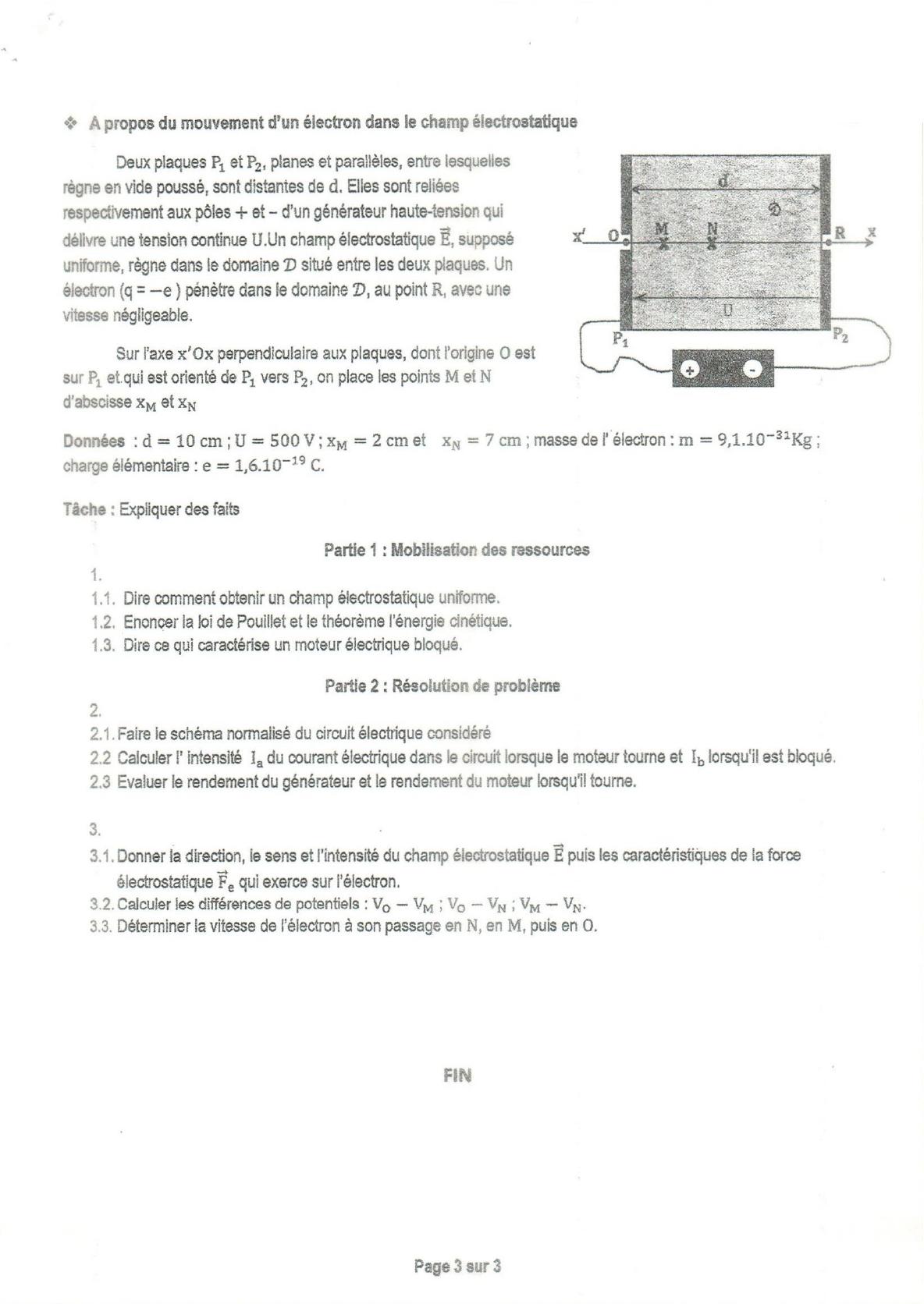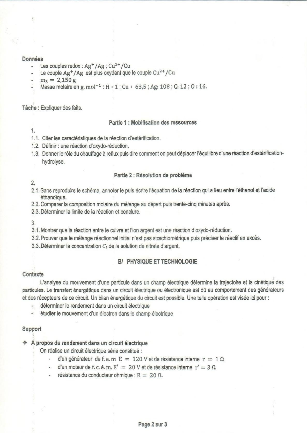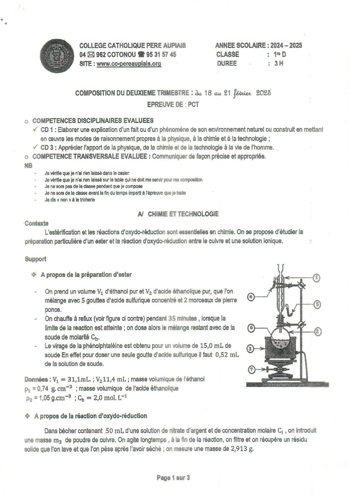 Examen PCT : Chimie, Physique, Technologie - Première D