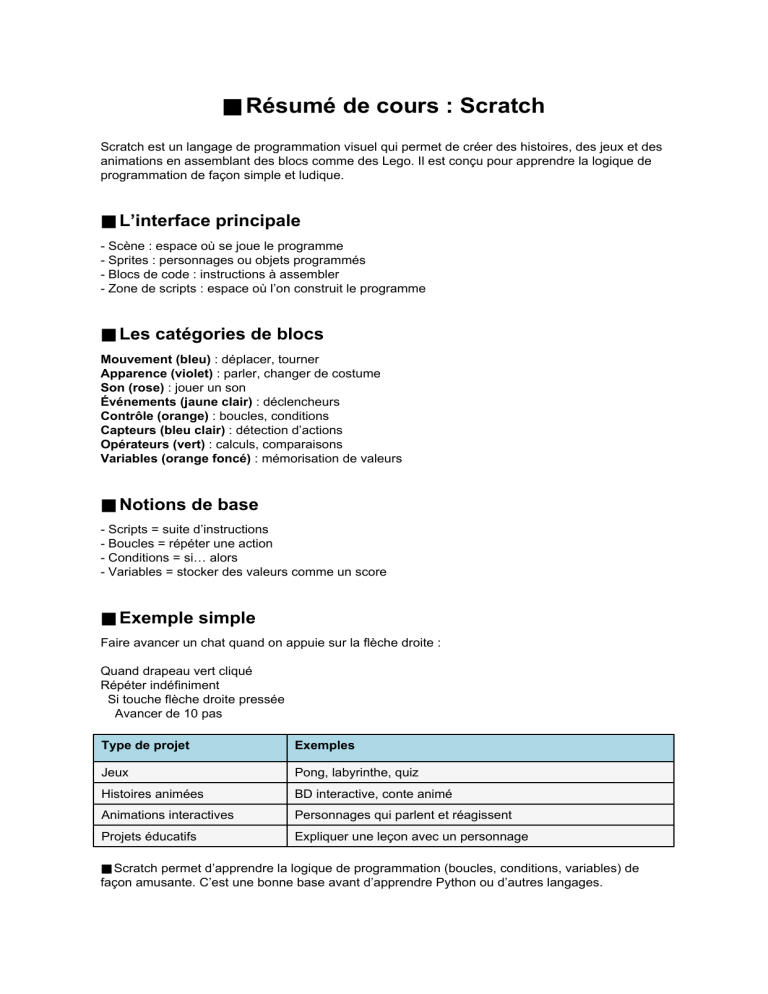 Résumé de cours Scratch : Apprenez la programmation visuelle