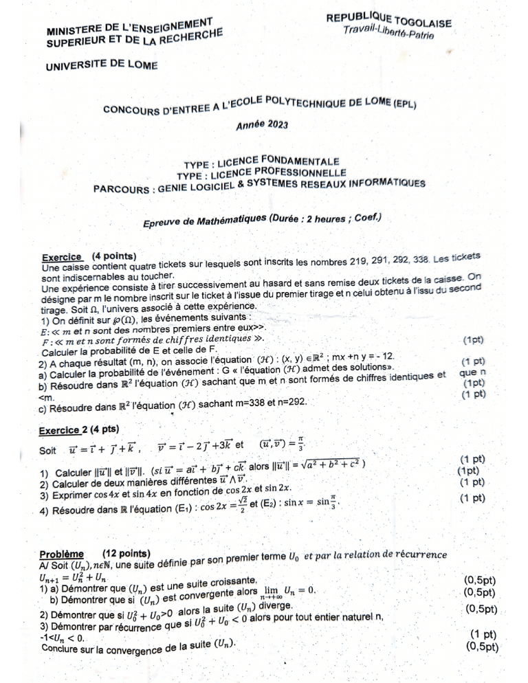 Concours EPL Lomé 2023 - Épreuve de Mathématiques Licence