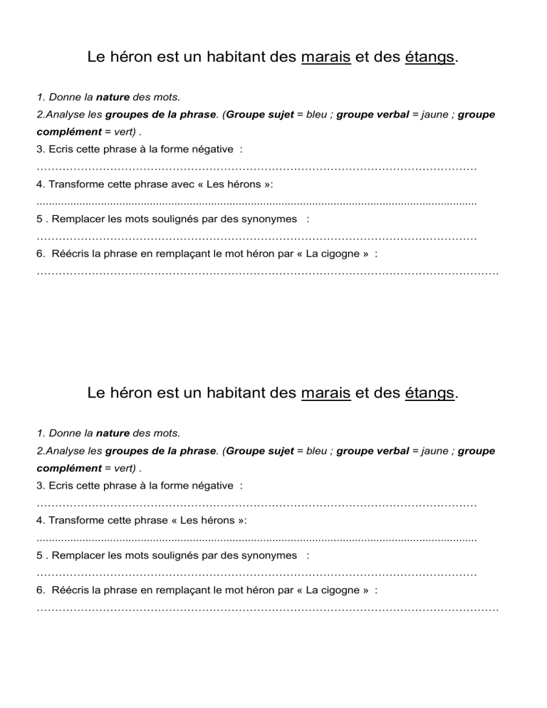 Exercices de grammaire française : Le héron, nature des mots et groupes