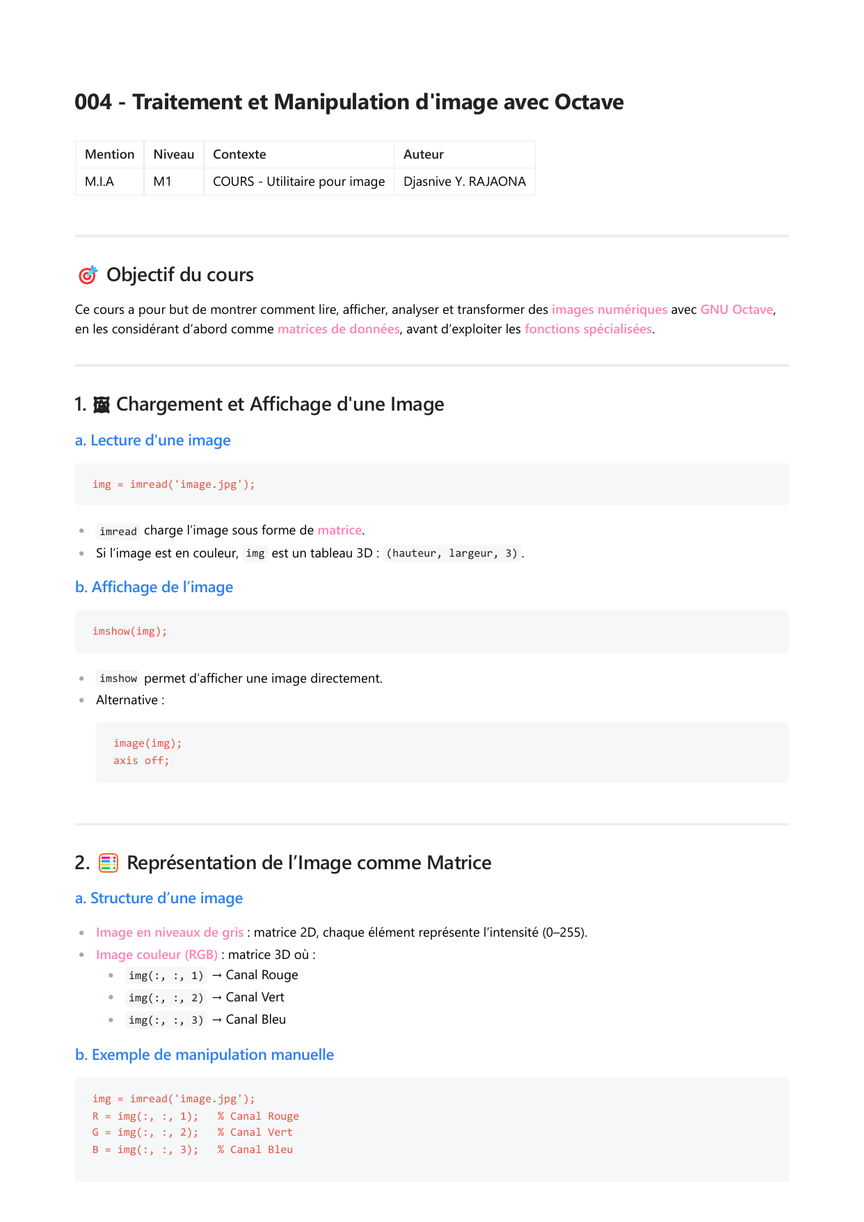 Traitement d'image avec Octave: Notes de cours